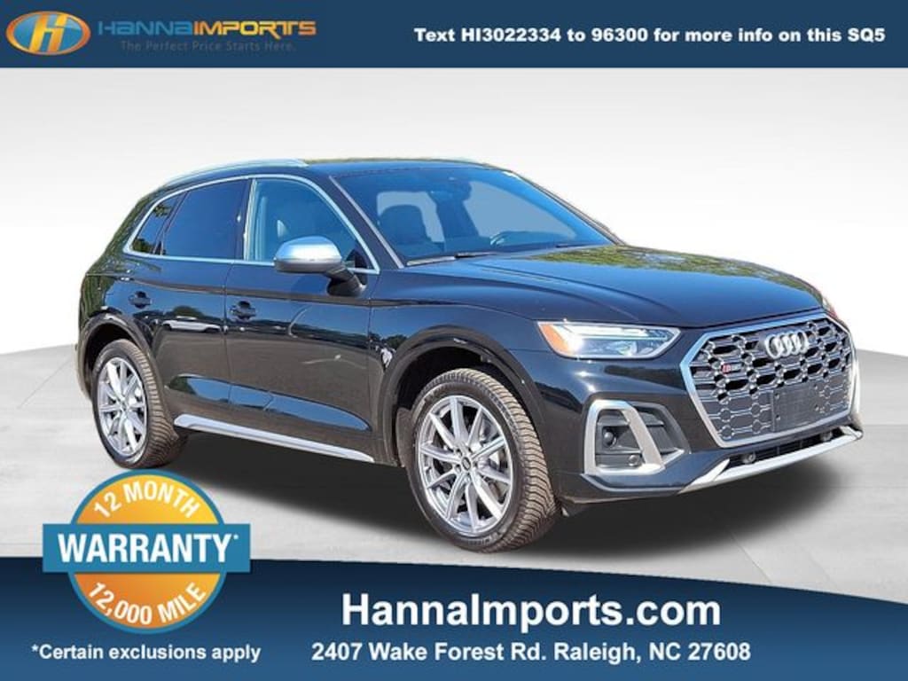 Why shop with Hanna Imports? We specialize in hand-selecting top-quality used cars, trucks, and SUVs for drivers across Raleigh, Durham, Cary, Chapel Hill, and the greater Triangle area of North Carolina. Our massive selection of 1,000+ vehicles on our Raleigh lot is carefully curated to include the most sought-after models, all priced below market value. We believe in transparency and efficiencyâ€"our vehicles are aggressively priced from the start, which means no haggling, no hassle, and no wasted time. The price you see is our absolute best price. Whether you're coming from Wake Forest, Apex, Garner, or anywhere in central NC, we’re committed to making your car-buying experience smooth, affordable, and enjoyable. Come see why Hanna Imports is one of the most trusted used car dealerships in North Carolina! Used Audi SQ5 in Raleigh. Used Audi SQ5 in North Carolina, Navigation Package (Radio: MMI Navigation Plus), SQ5 Premium Plus quattro, 3.0L TFSI, Exterior Parking Camera Rear, Heated front seats, Power Liftgate, 10 Speakers, 3.204 Axle Ratio, 4-Wheel Disc Brakes, ABS brakes, Adaptive suspension, Air Conditioning, Alloy wheels, AM/FM radio, AM/FM Stereo, Auto High-beam Headlights, Auto-dimming Rear-View mirror, Automatic temperature control, Brake assist, Bumpers: body-color, Compass, Delay-off headlights, Driver door bin, Driver vanity mirror, Dual front impact airbags, Dual front side impact airbags, Electronic Stability Control, Emergency communication system: Audi connect CARE, Four wheel independent suspension, Front anti-roll bar, Front Bucket Seats, Front Center Armrest, Front dual zone A/C, Front fog lights, Front reading lights, Garage door transmitter: HomeLink, Heated door mirrors, Heated Front Sport Seats, Illuminated entry, Leather Shift Knob, Leather/Dinamica Seating Surfaces, Low tire pressure warning, Occupant sensing airbag, Outside temperature display, Overhead airbag, Overhead console, Panic alarm, Passenger door bin, Passenger vanity mirror, Power door mirrors, Power driver seat, Power passenger seat, Power steering, Power windows, Radio data system, Rain sensing wipers, Rear air conditioning, Rear anti-roll bar, Rear fog lights, Rear reading lights, Rear seat center armrest, Rear window defroster, Rear window wiper, Remote keyless entry, Roof rack, Security system, Speed control, Speed-sensing steering, Speed-Sensitive Wipers, Split folding rear seat, Spoiler, Sport steering wheel, Steering wheel mounted audio controls, Tachometer, Telescoping steering wheel, Tilt steering wheel, Traction control, Trip computer, Turn signal indicator mirrors, Variably intermittent wipers, and Wheels: 20" 10-Spoke-Star Design.
