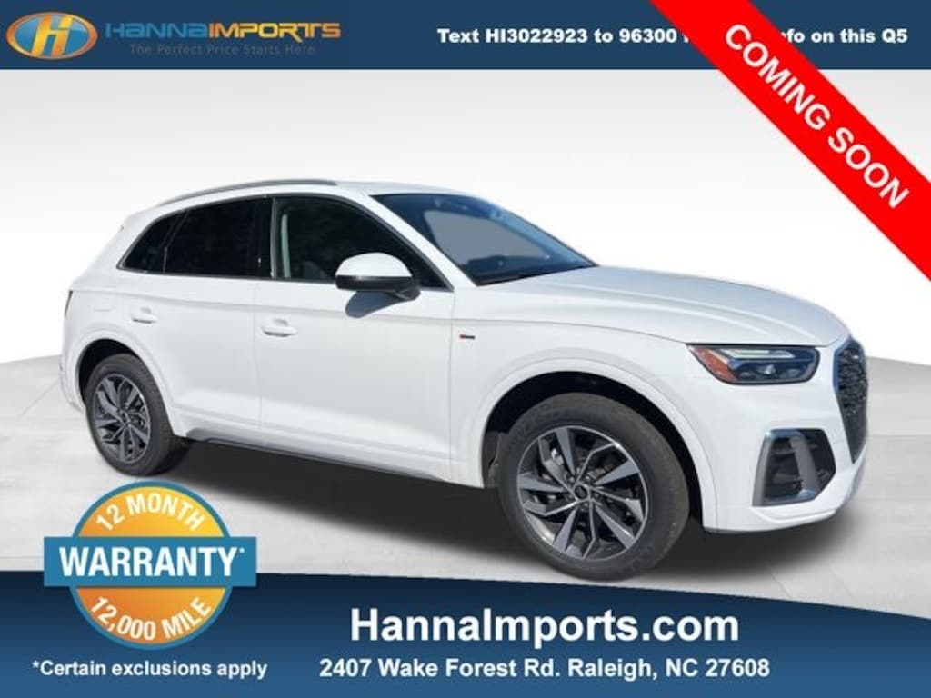 Why shop with Hanna Imports? We specialize in hand-selecting top-quality used cars, trucks, and SUVs for drivers across Raleigh, Durham, Cary, Chapel Hill, and the greater Triangle area of North Carolina. Our massive selection of 1,000+ vehicles on our Raleigh lot is carefully curated to include the most sought-after models, all priced below market value. We believe in transparency and efficiencyâ"our vehicles are aggressively priced from the start, which means no haggling, no hassle, and no wasted time. The price you see is our absolute best price. Whether you're coming from Wake Forest, Apex, Garner, or anywhere in central NC, weâre committed to making your car-buying experience smooth, affordable, and enjoyable. Come see why Hanna Imports is one of the most trusted used car dealerships in North Carolina! Used Audi Q5 in Raleigh. Used Audi Q5 in North Carolina, Convenience Package, Premium Plus Package (Audi Virtual Cockpit Plus, Bang & Olufsen Sound System w/3D Sound, Leatherette Covered Center Console & Door Armrests, Panoramic Sunroof, Power Adjustable Steering Column, Top View Camera System, and Wheels: 19" 5-Double-Arm Design Bi-Color Finish), Q5 45 S line Premium Plus quattro, Black w/Leather Seating Surfaces, ABS brakes, Alloy wheels, Compass, Electronic Stability Control, Exterior Parking Camera Rear, Front dual zone A/C, Heated door mirrors, Heated front seats, Illuminated entry, Low tire pressure warning, Power Liftgate, Remote keyless entry, Traction control, 10 Speakers, 4-Wheel Disc Brakes, 5.302 Axle Ratio, Air Conditioning, AM/FM radio, Auto High-beam Headlights, Auto-dimming Rear-View mirror, Automatic temperature control, Brake assist, Bumpers: body-color, Delay-off headlights, Driver door bin, Driver vanity mirror, Dual front impact airbags, Dual front side impact airbags, Emergency communication system: Audi connect CARE, Four wheel independent suspension, Front anti-roll bar, Front Bucket Seats, Front Center Armrest, Front fog lights, Front reading lights, Garage door transmitter: HomeLink, Genuine wood console insert, Genuine wood dashboard insert, Genuine wood door panel insert, Heated 8-Way Power Front Bucket Seats, Heated steering wheel, Leather Seating Surfaces, Leather Shift Knob, Leather steering wheel, Occupant sensing airbag, Outside temperature display, Overhead airbag, Overhead console, Panic alarm, Passenger door bin, Passenger vanity mirror, Power door mirrors, Power driver seat, Power passenger seat, Power steering, Power windows, Radio data system, Radio: Audi Sound System, Rain sensing wipers, Rear air conditioning, Rear anti-roll bar, Rear fog lights, Rear reading lights, Rear seat center armrest, Rear window defroster, Rear window wiper, Roof rack, Security system, Speed control, Speed-sensing steering, Speed-Sensitive Wipers, Split folding rear seat, Spoiler, Steering wheel mounted audio controls, Tachometer, Telescoping steering wheel, Tilt steering wheel, Trip computer, Turn signal indicator mirrors, Variably intermittent wipers, and Wheels: 18" 5-Arm-Turbine Design.