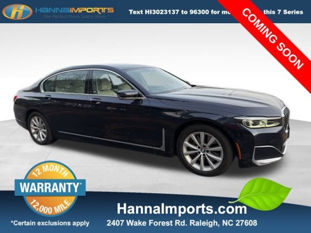 Why shop with Hanna Imports? We specialize in hand-selecting top-quality used cars, trucks, and SUVs for drivers across Raleigh, Durham, Cary, Chapel Hill, and the greater Triangle area of North Carolina. Our massive selection of 1,000+ vehicles on our Raleigh lot is carefully curated to include the most sought-after models, all priced below market value. We believe in transparency and efficiencyâ"our vehicles are aggressively priced from the start, which means no haggling, no hassle, and no wasted time. The price you see is our absolute best price. Whether you're coming from Wake Forest, Apex, Garner, or anywhere in central NC, weâre committed to making your car-buying experience smooth, affordable, and enjoyable. Come see why Hanna Imports is one of the most trusted used car dealerships in North Carolina! Used BMW 7 Series in Raleigh. Used BMW 7 Series in North Carolina, 7 Series 745e xDrive iPerformance, AWD, Ivory White/Black Leather, Apple CarPlay Compatibility, Navigation System, Power moonroof, 16 Speakers, 4-Wheel Disc Brakes, ABS brakes, Adaptive suspension, Air Conditioning, Alloy wheels, AM/FM radio: SiriusXM, Anti-whiplash front head restraints, Auto High-beam Headlights, Auto tilt-away steering wheel, Auto-dimming door mirrors, Auto-dimming Rear-View mirror, Auto-leveling suspension, Automatic temperature control, Brake assist, Bumpers: body-color, CD player, Dakota Leather Upholstery, Delay-off headlights, Door auto-latch, Driver door bin, Driver vanity mirror, Dual front impact airbags, Dual front side impact airbags, Electronic Stability Control, Emergency communication system: BMW Assist eCall, Four wheel independent suspension, Front anti-roll bar, Front Bucket Seats, Front Center Armrest, Front dual zone A/C, Front reading lights, Front Ventilated Seats, Fully automatic headlights, Garage door transmitter, Genuine wood console insert, Genuine wood dashboard insert, Genuine wood door panel insert, Grey Poplar Wood Trim, harman/kardon Surround Sound System, harman/kardon® Speakers, Head restraints memory, Heated door mirrors, Heated Front Seats, Heated front seats, Heated steering wheel, Illuminated entry, Knee airbag, Leather Shift Knob, Leather steering wheel, Low tire pressure warning, Memory seat, Multi-Contour Seats, Occupant sensing airbag, Outside temperature display, Overhead airbag, Overhead console, Panic alarm, Passenger door bin, Passenger vanity mirror, Power adjustable front head restraints, Power door mirrors, Power driver seat, Power passenger seat, Power steering, Power windows, Radio data system, Radio: AM/FM/HD w/In-Dash Single CD, Rain sensing wipers, Rear air conditioning, Rear anti-roll bar, Rear dual zone A/C, Rear reading lights, Rear seat center armrest, Rear Window Blind, Rear window defroster, Remote keyless entry, Security system, SiriusXM Satellite Radio, Speed control, Speed-sensing steering, Speed-Sensitive Wipers, Sport steering wheel, Steering wheel memory, Steering wheel mounted audio controls, Telescoping steering wheel, Tilt steering wheel, Traction control, Trip computer, Variably intermittent wipers, Weather band radio, and Wheels: 18" x 8.0" V-Spoke Style 642.