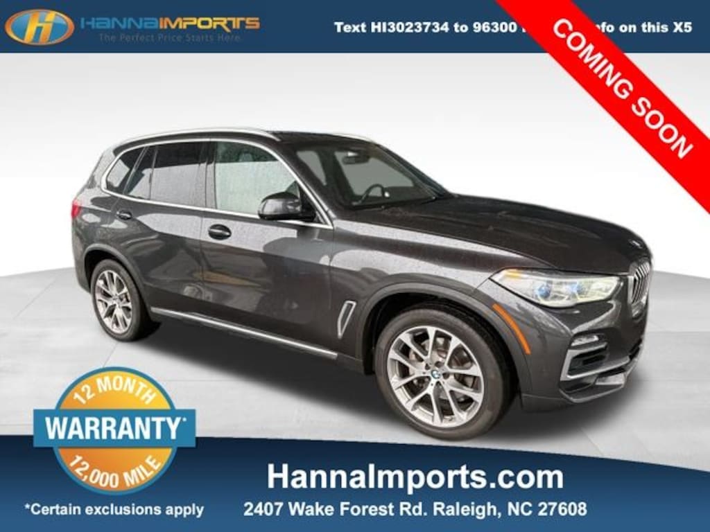 Why shop with Hanna Imports? We specialize in hand-selecting top-quality used cars, trucks, and SUVs for drivers across Raleigh, Durham, Cary, Chapel Hill, and the greater Triangle area of North Carolina. Our massive selection of 1,000+ vehicles on our Raleigh lot is carefully curated to include the most sought-after models, all priced below market value. We believe in transparency and efficiencyâ"our vehicles are aggressively priced from the start, which means no haggling, no hassle, and no wasted time. The price you see is our absolute best price. Whether you're coming from Wake Forest, Apex, Garner, or anywhere in central NC, weâre committed to making your car-buying experience smooth, affordable, and enjoyable. Come see why Hanna Imports is one of the most trusted used car dealerships in North Carolina! Used BMW X5 in Raleigh. Used BMW X5 in North Carolina, Connected Package Pro, Driving Assistance Professional Package (Active Driving Assistant Pro and Extended Traffic Jam Assistant), Executive Package 3 (4-Zone Automatic Climate Control, Gesture Control, Glass Controls, Head-Up Display, Icon Adaptive LED Headlights w/Laserlight, Panoramic Sky Lounge LED Roof, Rear Manual Side Window Shades, and Remote Engine Start), Luxury Seating Package 2 (Front Massaging Seats, Front Ventilated Seats, and Multi-Contour Seats), Parking Assistance Package (Active Park Distance Control, Drive Recorder, Parking Assistant Plus, Rear-View Camera, and Surround View w/3D View), X5 xDrive40i, Canberra Beige Canberra Beige Vernasca Ltr, Apple CarPlay Compatibility, Exterior Parking Camera Rear, Navigation System, 10 Speakers, 4-Wheel Disc Brakes, ABS brakes, Air Conditioning, Alloy wheels, AM/FM radio: SiriusXM with 360L, AM/FM Stereo, Apple CarPlay & Android Auto Compatibility, Auto High-beam Headlights, Auto tilt-away steering wheel, Auto-dimming door mirrors, Auto-dimming Rear-View mirror, Automatic temperature control, Axle Ratio: 3.385, BMW Assist eCall, BMW TeleServices, Brake assist, Bumpers: body-color, Compass, ConnectedDrive Services, Delay-off headlights, Driver door bin, Driver vanity mirror, Dual front impact airbags, Dual front side impact airbags, Electronic Stability Control, Emergency communication system: BMW Assist eCall, Four wheel independent suspension, Front & Rear Heated Seats, Front anti-roll bar, Front Bucket Seats, Front Center Armrest, Front dual zone A/C, Front fog lights, Front Massaging Seats (DISC), Front reading lights, Fully automatic headlights, Garage door transmitter, Genuine wood console insert, Genuine wood dashboard insert, Genuine wood door panel insert, Head restraints memory, Heated door mirrors, Heated Front Seats, Heated front seats, Heated Front Seats w/Armrests & Steering Wheel, Hi-Fi Sound System, Illuminated entry, Knee airbag, Leather Shift Knob, Leather steering wheel, Live Cockpit Pro w/Navigation, Low tire pressure warning, Lumbar Support, Memory seat, Occupant sensing airbag, Outside temperature display, Overhead airbag, Panic alarm, Passenger door bin, Passenger vanity mirror, Power adjustable front head restraints, Power door mirrors, Pow