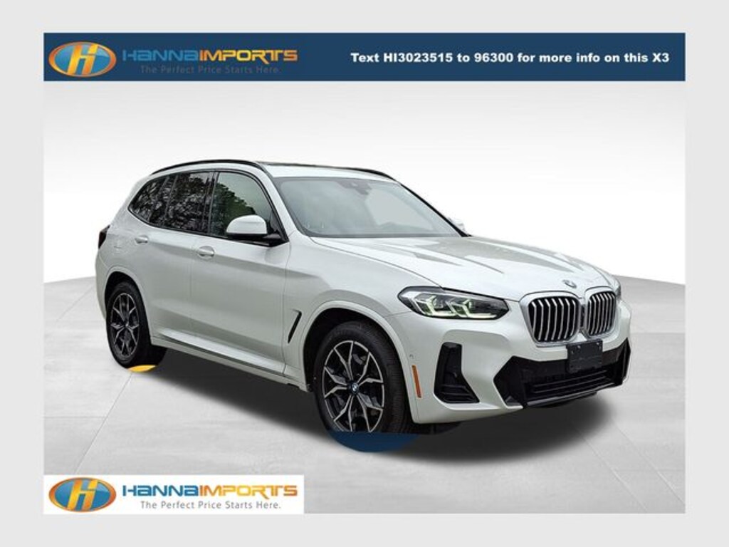 Why shop with Hanna Imports? We specialize in hand-selecting top-quality used cars, trucks, and SUVs for drivers across Raleigh, Durham, Cary, Chapel Hill, and the greater Triangle area of North Carolina. Our massive selection of 1,000+ vehicles on our Raleigh lot is carefully curated to include the most sought-after models, all priced below market value. We believe in transparency and efficiencyâ"our vehicles are aggressively priced from the start, which means no haggling, no hassle, and no wasted time. The price you see is our absolute best price. Whether you're coming from Wake Forest, Apex, Garner, or anywhere in central NC, weâre committed to making your car-buying experience smooth, affordable, and enjoyable. Come see why Hanna Imports is one of the most trusted used car dealerships in North Carolina! Used BMW X3 in Raleigh. Used BMW X3 in North Carolina, Connected Package Pro, M Sport Package (Aerodynamic Kit, M Steering Wheel, Roof Rails in High-Gloss Shadowline, Shadowline Exterior Trim, Smoke Grey Aluminum Rhombicle Trim, Wheels: 19" x 7.5" M Y-Spoke Bi-Color (Style 887M), and Without Exterior Lines Designation), M Sport Package (337), Parking Assistance Package (Active Park Distance Control, Parking Assistant Plus, Rear-View Camera, and Surround View w/3D View), Premium Package (Driver Lumbar Support, Heated Front Seats, Heated Steering Wheel, Live Cockpit Pro w/Navigation, and Panoramic Moonroof), X3 xDrive30i, 8-Speed Automatic Sport, AWD, Comfort Access Keyless Entry, Exterior Parking Camera Rear, Navigation, Navigation System, Power Liftgate, 12 Speakers, 3.385 Axle Ratio, 4-Wheel Disc Brakes, ABS brakes, Air Conditioning, Alloy wheels, AM/FM Radio, AM/FM radio: SiriusXM, Apple CarPlay & Android Auto Compatibility, Auto High-beam Headlights, Auto-dimming door mirrors, Auto-dimming Rear-View mirror, Automatic temperature control, BMW Assist eCall, BMW TeleServices, Brake assist, Bumpers: body-color, ConnectedDrive Services, Delay-off headlights, Driver door bin, Driver vanity mirror, Driver Width Adjustment, Dual front impact airbags, Dual front side impact airbags, Electronic Stability Control, Emergency communication system: BMW Assist eCall, Enhanced USB & Bluetooth w/Smartphone Integration, Fine Wood Open-Pored Ash Grain Trim, Four wheel independent suspension, Front anti-roll bar, Front Bucket Seats, Front Center Armrest, Front dual zone A/C, Front reading lights, Fully automatic headlights, Garage door transmitter, Genuine wood dashboard insert, Genuine wood door panel insert, Heated door mirrors, Hi-Fi Sound System, Illuminated entry, Knee airbag, Low tire pressure warning, Memory seat, Occupant sensing airbag, Outside temperature display, Overhead airbag, Panic alarm, Passenger door bin, Passenger vanity mirror, Perforated SensaTec Upholstery, Power door mirrors, Power driver seat, Power Front Seats, Power passenger seat, Power steering, Power windows, Radio data system, Rain sensing wipers, Rear air conditioning, Rear anti-roll bar, Rear reading lights, Rear seat center armrest, Rear window defroster, Rear window wiper, Remote Engine Start, Remote keyless entry, Security system, SiriusXM Satellite Radio, Speed control, Sp