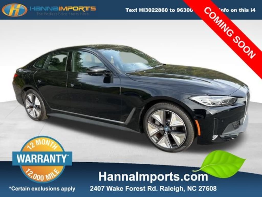 Why shop with Hanna Imports? We specialize in hand-selecting top-quality used cars, trucks, and SUVs for drivers across Raleigh, Durham, Cary, Chapel Hill, and the greater Triangle area of North Carolina. Our massive selection of 1,000+ vehicles on our Raleigh lot is carefully curated to include the most sought-after models, all priced below market value. We believe in transparency and efficiencyâ"our vehicles are aggressively priced from the start, which means no haggling, no hassle, and no wasted time. The price you see is our absolute best price. Whether you're coming from Wake Forest, Apex, Garner, or anywhere in central NC, weâre committed to making your car-buying experience smooth, affordable, and enjoyable. Come see why Hanna Imports is one of the most trusted used car dealerships in North Carolina! Used BMW i4 in Raleigh. Used BMW i4 in North Carolina, Connected Package Pro, Parking Assistance Package (Active Park Distance Control, Parking Assistant Plus, Rear-View Camera, and Surround View w/3D View), Premium Package (Ambient Lighting, Driver Lumbar Support, Heated Front Seats, Heated Steering Wheel, and Iconic Sounds Electric), 4D Hatchback, Exterior Parking Camera Rear, Navigation system: BMW Maps Navigation, Power Liftgate, Power moonroof, 10 Speakers, 4-Wheel Disc Brakes, ABS brakes, Air Conditioning, Alloy wheels, Apple CarPlay & Android Auto Compatibility, Auto High-beam Headlights, Auto-dimming door mirrors, Auto-dimming Rear-View mirror, Auto-leveling suspension, Automatic temperature control, BMW Assist eCall, BMW Curved Display, BMW Curved Display w/HUD, BMW TeleServices, Brake assist, Bumpers: body-color, Compass, ConnectedDrive Services, Delay-off headlights, Driver door bin, Driver vanity mirror, Dual front impact airbags, Dual front side impact airbags, Electronic Stability Control, Emergency communication system: BMW Assist eCall, Four wheel independent suspension, Front anti-roll bar, Front Bucket Seats, Front Center Armrest, Front dual zone A/C, Front reading lights, Fully automatic headlights, Garage door transmitter, harman/kardon Surround Sound System, Heated door mirrors, Hi-Fi Sound System, Illuminated entry, Leather steering wheel, Low tire pressure warning, Memory seat, Occupant sensing airbag, Outside temperature display, Overhead airbag, Overhead console, Panic alarm, Passenger door bin, Passenger vanity mirror, Perforated Sensatec Upholstery, Power door mirrors, Power driver seat, Power Front Seats, Power passenger seat, Power steering, Power windows, Radio data system, Radio: FM Audio System, Rain sensing wipers, Rear air conditioning, Rear anti-roll bar, Rear reading lights, Rear seat center armrest, Rear window defroster, Remote keyless entry, Security system, Shadowline Exterior Trim, SiriusXM Satellite Radio w/1 Year Subscription, Speed control, Speed-sensing steering, Speed-Sensitive Wipers, Split folding rear seat, Sport Seats, Sport steering wheel, Steering wheel mounted audio controls, Telescoping steering wheel, Tilt steering wheel, Traction control, Trip computer, Turn signal indicator mirrors, Variably intermittent wipers, Wheels: 18" x 7.5" Gunmetal Grey Aero, Wheels: 19" x 8.5" Fr & 19" x 9.0" Rr Bicolor, and Wireless Device Charging.