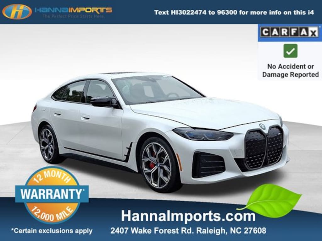 Why shop with Hanna Imports? We specialize in hand-selecting top-quality used cars, trucks, and SUVs for drivers across Raleigh, Durham, Cary, Chapel Hill, and the greater Triangle area of North Carolina. Our massive selection of 1,000+ vehicles on our Raleigh lot is carefully curated to include the most sought-after models, all priced below market value. We believe in transparency and efficiencyâ"our vehicles are aggressively priced from the start, which means no haggling, no hassle, and no wasted time. The price you see is our absolute best price. Whether you're coming from Wake Forest, Apex, Garner, or anywhere in central NC, weâre committed to making your car-buying experience smooth, affordable, and enjoyable. Come see why Hanna Imports is one of the most trusted used car dealerships in North Carolina! Used BMW i4 in Raleigh. Used BMW i4 in North Carolina, Connected Package Pro, M Sport Package Pro, Parking Assistance Package (Active Park Distance Control, Parking Assistant Plus, Rear-View Camera, and Surround View w/3D View), Premium Package (Ambient Lighting, BMW Curved Display w/HUD, Driver Lumbar Support, Heated Front Seats, and Heated Steering Wheel), Shadowline Package (Extended Shadowline Trim, M Shadowline Lights, and M Sport Brakes w/Red Calipers), i4 M50, Electric Motor, Apple CarPlay & Android Auto Compatibility, Exterior Parking Camera Rear, Navigation system: BMW Maps Navigation, Power Liftgate, Power moonroof, 10 Speakers, 4-Wheel Disc Brakes, ABS brakes, Adaptive suspension, Air Conditioning, Alloy wheels, Auto High-beam Headlights, Auto-dimming door mirrors, Auto-dimming Rear-View mirror, Auto-leveling suspension, Automatic temperature control, BMW Assist eCall, BMW Curved Display, BMW TeleServices, Brake assist, Bumpers: body-color, Compass, ConnectedDrive Services, Delay-off headlights, Drive Recorder, Driver door bin, Driver vanity mirror, Dual front impact airbags, Dual front side impact airbags, Electronic Stability Control, Emergency communication system: BMW Assist eCall, Four wheel independent suspension, Front anti-roll bar, Front Bucket Seats, Front Center Armrest, Front dual zone A/C, Front reading lights, Fully automatic headlights, Garage door transmitter, harman/kardon Surround Sound System, Heated door mirrors, Hi-Fi Sound System, Icon Adaptive LED Headlights w/Laserlight, Illuminated entry, Leather steering wheel, Low tire pressure warning, Memory seat, Occupant sensing airbag, Outside temperature display, Overhead airbag, Overhead console, Panic alarm, Passenger door bin, Passenger vanity mirror, Perforated Sensatec Upholstery, Power door mirrors, Power driver seat, Power Front Seats, Power passenger seat, Power steering, Power windows, Radio data system, Radio: FM Audio System, Rain sensing wipers, Rear air conditioning, Rear anti-roll bar, Rear reading lights, Rear seat center armrest, Rear window defroster, Remote keyless entry, Security system, SiriusXM Satellite Radio w/1 Year Subscription, Speed control, Speed-sensing steering, Speed-Sensitive Wipers, Split folding rear seat, Spoiler, Sport Seats, Sport steering wheel, Steering wheel mounted audio controls, Telescoping steering wheel, Tilt steering wheel, Traction control, Trip computer, Turn signal indicator mirrors, Variably intermittent wipers, Wheels: 1