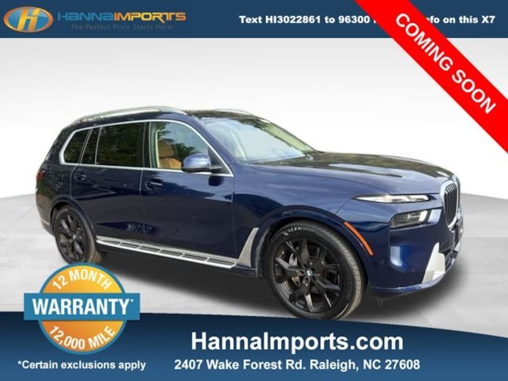 Why shop with Hanna Imports? We specialize in hand-selecting top-quality used cars, trucks, and SUVs for drivers across Raleigh, Durham, Cary, Chapel Hill, and the greater Triangle area of North Carolina. Our massive selection of 1,000+ vehicles on our Raleigh lot is carefully curated to include the most sought-after models, all priced below market value. We believe in transparency and efficiencyâ€"our vehicles are aggressively priced from the start, which means no haggling, no hassle, and no wasted time. The price you see is our absolute best price. Whether you're coming from Wake Forest, Apex, Garner, or anywhere in central NC, we’re committed to making your car-buying experience smooth, affordable, and enjoyable. Come see why Hanna Imports is one of the most trusted used car dealerships in North Carolina! Used BMW X7 in Raleigh. Used BMW X7 in North Carolina, Climate Comfort Package (5-Zone Automatic Climate Control, Front & Rear Heated Seats, and Front Ventilated Seats), Connected Package Pro, Driving Assistance Professional Package (Active Cruise Control w/Stop & Go, Active Driving Assistant Pro, Active Lane Keeping Assistant, Highway Assistant, and Traffic Jam Assistant), Parking Assistance Package (Drive Recorder, Parking Assistant Professional, and Surround View w/3D View), Premium Package (Gesture Control, harman/kardon Surround Sound System, Rear Electric Side Window Shades, and Soft-Close Automatic Doors), X7 xDrive40i, AWD, Tanzanite Blue II Metallic, Apple CarPlay & Android Auto Compatibility, Apple CarPlay Compatibility, Exterior Parking Camera Rear, Navigation system: BMW Maps Navigation, Power moonroof: Panorama, 10 Speakers, 3.64 Axle Ratio, 3rd row seats: split-bench, 4-Wheel Disc Brakes, ABS brakes, Adaptive suspension, Air Conditioning, Alloy wheels, Aluminum Running Boards, AM/FM radio: SiriusXM with 360L, AM/FM Stereo, Auto High-beam Headlights, Auto tilt-away steering wheel, Auto-dimming door mirrors, Auto-dimming Rear-View mirror, Auto-leveling suspension, Automatic temperature control, BMW Assist eCall, BMW TeleServices, Brake assist, Bumpers: body-color, Compass, ConnectedDrive Services, Delay-off headlights, Driver door bin, Driver vanity mirror, Dual front impact airbags, Dual front side impact airbags, Electronic Stability Control, Emergency communication system: BMW Assist eCall, Four wheel independent suspension, Front anti-roll bar, Front Bucket Seats, Front Center Armrest, Front dual zone A/C, Front reading lights, Fully automatic headlights, Garage door transmitter, Genuine wood console insert, Genuine wood dashboard insert, Genuine wood door panel insert, Head restraints memory, Heads-Up Display, Heated door mirrors, Heated front seats, Heated Multi-Contour Seats, Heated steering wheel, Hi-Fi Sound System, Illuminated entry, Knee airbag, Leather steering wheel, Live Cockpit Pro, Low tire pressure warning, Memory seat, Occupant sensing airbag, Outside temperature display, Overhead airbag, Panic alarm, Passenger door bin, Passenger vanity mirror, Personal eSIM 5G, Power adjustable front head rest