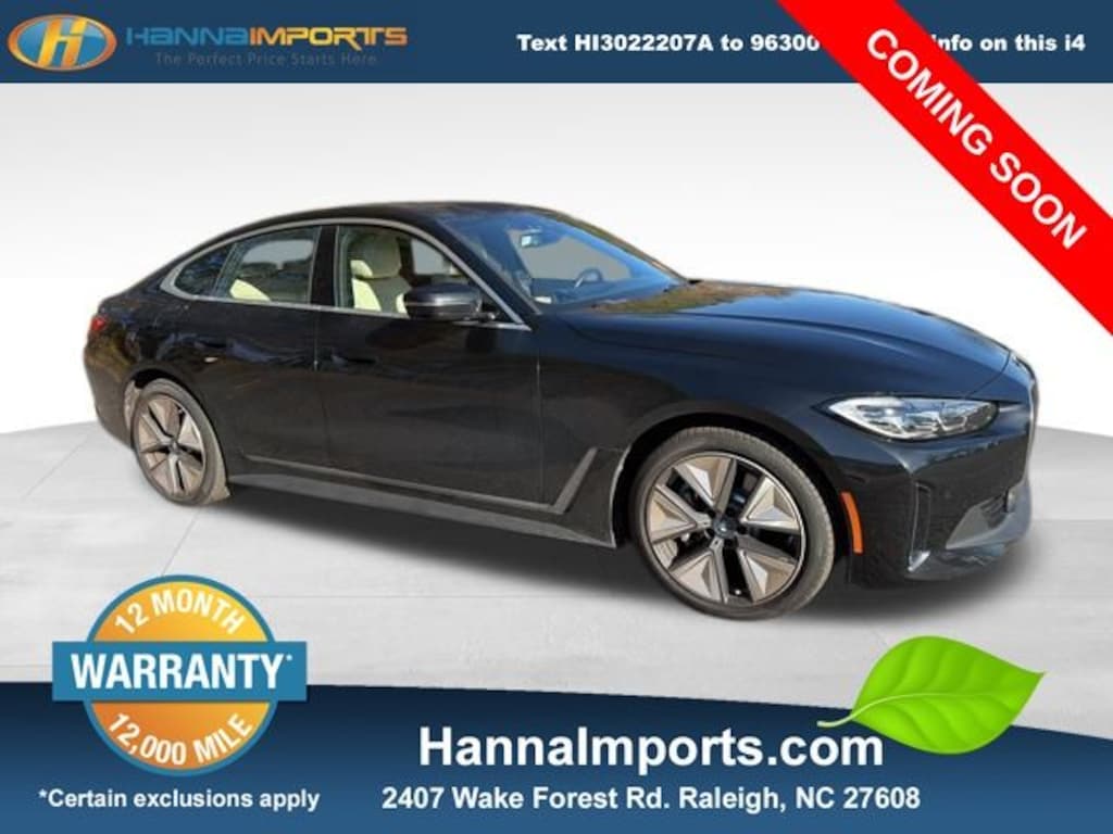 Why shop with Hanna Imports? We specialize in hand-selecting top-quality used cars, trucks, and SUVs for drivers across Raleigh, Durham, Cary, Chapel Hill, and the greater Triangle area of North Carolina. Our massive selection of 1,000+ vehicles on our Raleigh lot is carefully curated to include the most sought-after models, all priced below market value. We believe in transparency and efficiencyâ"our vehicles are aggressively priced from the start, which means no haggling, no hassle, and no wasted time. The price you see is our absolute best price. Whether you're coming from Wake Forest, Apex, Garner, or anywhere in central NC, weâre committed to making your car-buying experience smooth, affordable, and enjoyable. Come see why Hanna Imports is one of the most trusted used car dealerships in North Carolina! Used BMW i4 in Raleigh. Used BMW i4 in North Carolina, Connected Package Pro, Premium Package (BMW Curved Display w/HUD, Heated Front Seats, Heated Steering Wheel, Iconic Sounds Electric, Lumbar Support, and Wireless Device Charging), Exterior Parking Camera Rear, Navigation system: BMW Maps Navigation, Power Liftgate, Power moonroof, 10 Speakers, 4-Wheel Disc Brakes, ABS brakes, Air Conditioning, Alloy wheels, Apple CarPlay & Android Auto Compatibility, Auto High-beam Headlights, Auto-dimming door mirrors, Auto-dimming Rear-View mirror, Auto-leveling suspension, Automatic temperature control, BMW Assist eCall, BMW TeleServices, Brake assist, Bumpers: body-color, Compass, ConnectedDrive Services, Delay-off headlights, Driver door bin, Driver vanity mirror, Dual front impact airbags, Dual front side impact airbags, Electronic Stability Control, Emergency communication system: BMW Assist eCall, Four wheel independent suspension, Front anti-roll bar, Front Bucket Seats, Front Center Armrest, Front dual zone A/C, Front reading lights, Fully automatic headlights, Garage door transmitter, Heated door mirrors, Hi-Fi Sound System, Illuminated entry, Leather steering wheel, Low tire pressure warning, Memory seat, Navigation, Occupant sensing airbag, Outside temperature display, Overhead airbag, Overhead console, Panic alarm, Passenger door bin, Passenger vanity mirror, Perforated Sensatec Upholstery, Power door mirrors, Power driver seat, Power Front Seats, Power passenger seat, Power steering, Power windows, Radio data system, Radio: FM Audio System, Rain sensing wipers, Rear air conditioning, Rear anti-roll bar, Rear reading lights, Rear seat center armrest, Rear window defroster, Remote keyless entry, Security system, SiriusXM w/360L & 1 Yr Platinum Plan Subscription, Speed control, Speed-sensing steering, Speed-Sensitive Wipers, Split folding rear seat, Sport Seats, Sport steering wheel, Steering wheel mounted audio controls, Telescoping steering wheel, Tilt steering wheel, Traction control, Trip computer, Turn signal indicator mirrors, Variably intermittent wipers, Wheels: 18" x 7.5" Gunmetal Grey Aero, Wheels: 19" x 8.5" Fr & 19" x 9.0" Rr Bicolor, and Widescreen Display.