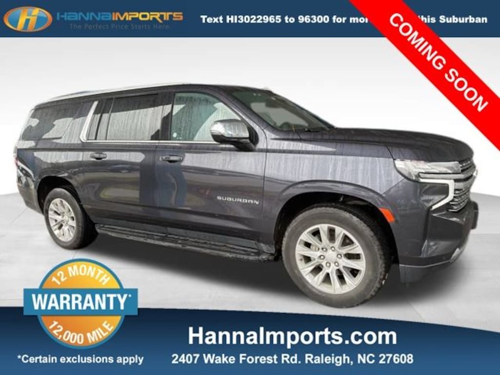 Why shop with Hanna Imports? We specialize in hand-selecting top-quality used cars, trucks, and SUVs for drivers across Raleigh, Durham, Cary, Chapel Hill, and the greater Triangle area of North Carolina. Our massive selection of 1,000+ vehicles on our Raleigh lot is carefully curated to include the most sought-after models, all priced below market value. We believe in transparency and efficiencyâ"our vehicles are aggressively priced from the start, which means no haggling, no hassle, and no wasted time. The price you see is our absolute best price. Whether you're coming from Wake Forest, Apex, Garner, or anywhere in central NC, weâre committed to making your car-buying experience smooth, affordable, and enjoyable. Come see why Hanna Imports is one of the most trusted used car dealerships in North Carolina! Used Chevrolet Suburban in Raleigh. Used Chevrolet Suburban in North Carolina, License Plate Front Mounting Package, Preferred Equipment Group 1LZ (1st & 2nd Row Color-Keyed Carpeted Floor Mats, 3rd Row 60/40 Power-Folding Split-Bench, Auto-Dimming Inside Rear-View Mirror, Bose 10-Speaker Surround w/CenterPoint, Bright Front & Rear Door Sill Plates, Chrome Door Handles w/Body-Color Strip, Chrome Mirror Caps, Color-Keyed Carpeting Floor Covering, Driver & Front Outboard Passenger Airbags, Dual Exhaust System, Enhanced Driver Information Center, Floor Console, Hands-Free Rear Power Programmable Liftgate, Heated & Ventilated Driver & Front Passenger Seats, Heated 2nd Row Outboard Seats, Heated Driver & Front Passenger Seats, Heated Steering Wheel, Infotainment Display, Lane Change Alert w/Side Blind Zone Alert, LED Daytime Running Lamps, Memory Settings, Outside Heated Power-Adjustable Mirrors, Power Release 2nd Row Bucket Seats, Power Tilt & Telescopic Steering Column, Rear Cross Traffic Alert, Remote Start, Safety Alert Seat, SiriusXM Radio w/360L, Universal Home Remote, Wireless Charging, and Wrapped Steering Wheel), Suburban Premier, 10 Speakers, 20" x 9" Polished Aluminum Wheels, 3.23 Rear Axle Ratio, 3rd row seats: split-bench, 4-Wheel Disc Brakes, ABS brakes, Adaptive suspension, Air Conditioning, Alloy wheels, AM/FM radio: SiriusXM with 360L, Apple CarPlay/Android Auto, Auto High-beam Headlights, Auto-dimming door mirrors, Auto-dimming Rear-View mirror, Auto-leveling suspension, Automatic temperature control, Brake assist, Bumpers: body-color, Compass, Delay-off headlights, Deleted 3 Years of Remote Access, Driver door bin, Driver vanity mirror, Dual front impact airbags, Dual front side impact airbags, Electronic Stability Control, Emergency communication system: OnStar and Chevrolet connected services capable, Four wheel independent suspension, Front anti-roll bar, Front Bucket Seats, Front Center Armrest, Front dual zone A/C,