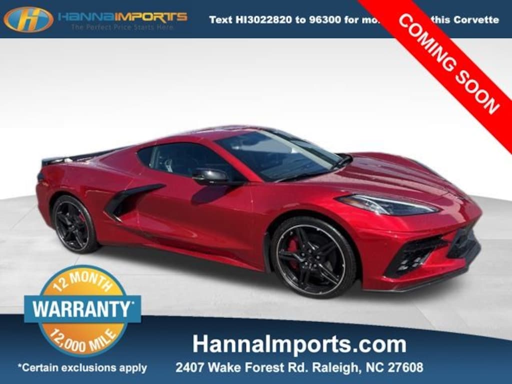 Why shop with Hanna Imports? We specialize in hand-selecting top-quality used cars, trucks, and SUVs for drivers across Raleigh, Durham, Cary, Chapel Hill, and the greater Triangle area of North Carolina. Our massive selection of 1,000+ vehicles on our Raleigh lot is carefully curated to include the most sought-after models, all priced below market value. We believe in transparency and efficiencyâ€"our vehicles are aggressively priced from the start, which means no haggling, no hassle, and no wasted time. The price you see is our absolute best price. Whether you're coming from Wake Forest, Apex, Garner, or anywhere in central NC, we’re committed to making your car-buying experience smooth, affordable, and enjoyable. Come see why Hanna Imports is one of the most trusted used car dealerships in North Carolina! Used Chevrolet Corvette in Raleigh. Used Chevrolet Corvette in North Carolina, Carbon Flash Metallic Painted Outside Mirrors (Carbon Flash Metallic-Painted Outside Mirrors), Coupe Engine Appearance Package, Memory Driver & Passenger Convenience Package, Preferred Equipment Group 2LT (2 Cargo Nets, Bose Performance Series Sound System w/14 Speakers, Driver Power Bolster Seat Adjuster, Electrical Theft Deterrent System, HD Front & Rear Vision Cameras, Head-Up Display, Heated & Vented Driver & Passenger Seats, Heated Steering Wheel, Passenger Power Bolster Seat Adjuster, Performance Data & Video Recorder, Power Driver Lumbar Control Seat Adjuster, Power Passenger Lumbar Control Seat Adjuster, Power-Adjustable Outside Heated Mirrors, Rear Cross Traffic Alert, Side Blind Zone Alert, Universal Home Remote, Vehicle Inclination Theft Deterrent Sensor, Vehicle Interior Movement Theft Deterrent Sensor, and Wireless Charging for Devices), Z51 Performance Package (Electronic Limited-Slip Differential, Heavy-Duty Cooling System, Performance Exhaust w/Stainless-Steel Tips, Performance Rear Axle Ratio, Rear Z51 Spoiler, Z51 Performance Brakes, and Z51 Performance Suspension), Corvette Stingray 2LT, Red Mist Metallic Tintcoat, Body-Color Removable Roof Panel, Exterior Parking Camera Rear, Navigation System, 14 Speakers, 4-Wheel Disc Brakes, 8-Way Power Driver Seat Adjuster, 8-Way Power Passenger Seat Adjuster, ABS brakes, Air Conditioning, Alloy wheels, AM/FM radio: SiriusXM, Auto High-beam Headlights, Auto-dimming door mirrors, Auto-dimming Rear-View mirror, Automatic Leveling System Headlamp Control, Automatic temperature control, Black Exhaust Tips, Brake assist, Bumpers: body-color, Carbon Fiber Interior Trim, Compass, Delay-off headlights, Driver door bin, Driver v