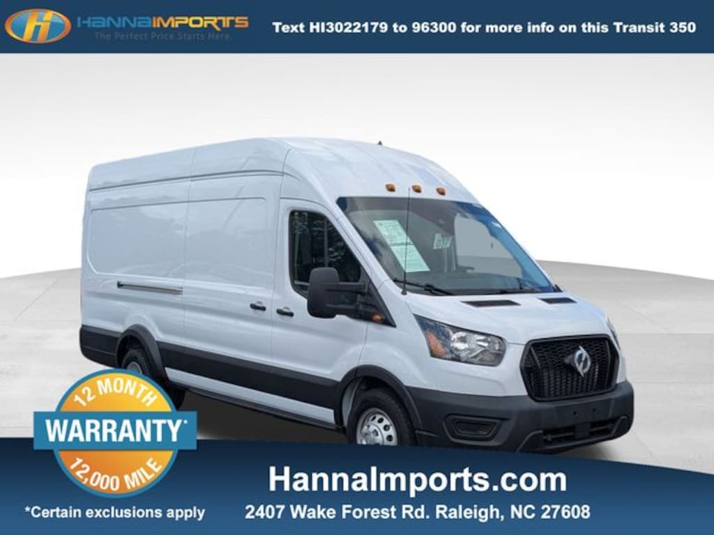 Why shop with Hanna Imports? We specialize in hand-selecting top-quality used cars, trucks, and SUVs for drivers across Raleigh, Durham, Cary, Chapel Hill, and the greater Triangle area of North Carolina. Our massive selection of 1,000+ vehicles on our Raleigh lot is carefully curated to include the most sought-after models, all priced below market value. We believe in transparency and efficiencyâ"our vehicles are aggressively priced from the start, which means no haggling, no hassle, and no wasted time. The price you see is our absolute best price. Whether you're coming from Wake Forest, Apex, Garner, or anywhere in central NC, weâre committed to making your car-buying experience smooth, affordable, and enjoyable. Come see why Hanna Imports is one of the most trusted used car dealerships in North Carolina! Used Ford Transit-350 in Raleigh. Used Ford Transit-350 in North Carolina, Order Code 101A, Electric, 4 Speakers, 4-Wheel Disc Brakes, 4.10 Limited-Slip Axle Ratio, ABS brakes, Air Conditioning, AM/FM radio, AM/FM Stereo, Auto High-beam Headlights, Auto Start-Stop Switch Delete, Back Up Alarm, Brake assist, Dark Palazzo Gray Vinyl Bucket Seats, Delay-off headlights, Driver door bin, Driver's Seat Mounted Armrest, Dual front impact airbags, Dual front side impact airbags, Dual rear wheels, Electronic Stability Control, Exterior Parking Camera Rear, Fixed Rear Cargo Door Glass, Front & Rear Vinyl Floor Covering, Front anti-roll bar, Front Bucket Seats, Front reading lights, Front wheel independent suspension, Fully automatic headlights, Heavy-Duty Front Axle, Illuminated entry, Long-Arm Manual-Folding Power Adjusting Mirrors, Low tire pressure warning, Occupant sensing airbag, Overhead airbag, Panic alarm, Passenger cancellable airbag, Passenger door bin, Power door mirrors, Power steering, Power windows, Rear-Window Defroster, Rearview Mirror, Remote keyless entry, Reverse Sensing System, Short-Arm Manual-Folding Power Adjust Mirrors, Steering wheel mounted audio controls, Tachometer, Telescoping steering wheel, Tilt steering wheel, Traction control, Variably intermittent wipers, Vinyl Front Bucket Seats, and Wheels: 16" Heavy Duty Silver Steel.