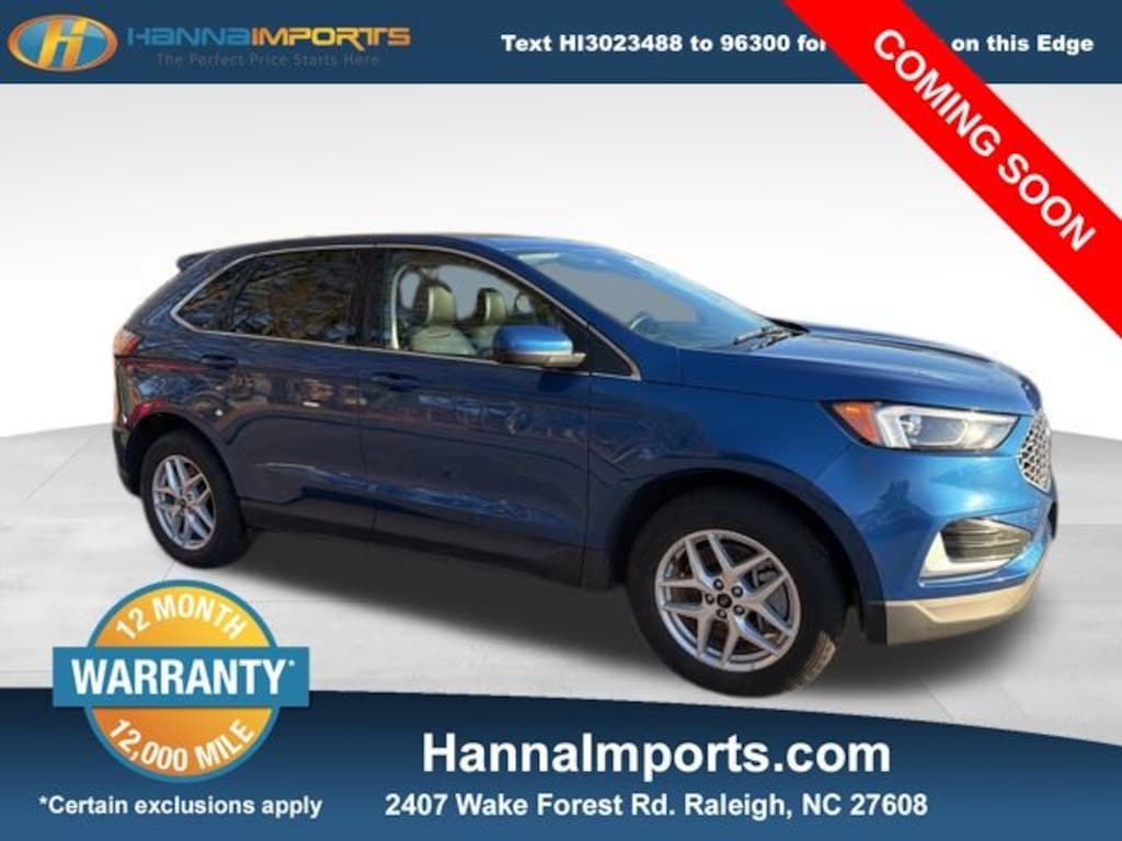 Why shop with Hanna Imports? We specialize in hand-selecting top-quality used cars, trucks, and SUVs for drivers across Raleigh, Durham, Cary, Chapel Hill, and the greater Triangle area of North Carolina. Our massive selection of 1,000+ vehicles on our Raleigh lot is carefully curated to include the most sought-after models, all priced below market value. We believe in transparency and efficiencyâ"our vehicles are aggressively priced from the start, which means no haggling, no hassle, and no wasted time. The price you see is our absolute best price. Whether you're coming from Wake Forest, Apex, Garner, or anywhere in central NC, weâre committed to making your car-buying experience smooth, affordable, and enjoyable. Come see why Hanna Imports is one of the most trusted used car dealerships in North Carolina! Used Ford Edge in Raleigh. Used Ford Edge in North Carolina, Edge SEL, AWD, Rear Parking Sensors, Remote keyless entry, 3.80 Axle Ratio, 4-Wheel Disc Brakes, 6 Speakers, ABS brakes, ActiveX Trimmed Heated Bucket Seats, Air Conditioning, Alloy wheels, AM/FM radio: SiriusXM with 360L, AM/FM Stereo, Auto High-beam Headlights, Auto-dimming Rear-View mirror, Automatic temperature control, Brake assist, Bumpers: body-color, Compass, Delay-off headlights, Driver door bin, Driver vanity mirror, Dual front impact airbags, Dual front side impact airbags, Electronic Stability Control, Emergency communication system: SYNC 4 911 Assist, FordPass Connect, Four wheel independent suspension, Front anti-roll bar, Front Bucket Seats, Front Center Armrest w/Storage, Front dual zone A/C, Front License Plate Bracket, Front reading lights, Fully automatic headlights, Heated door mirrors, Heated front seats, Illuminated entry, Knee airbag, Leather steering wheel, Low tire pressure warning, Occupant sensing airbag, Outside temperature display, Overhead airbag, Overhead console, Panic alarm, Passenger door bin, Passenger vanity mirror, Power door mirrors, Power driver seat, Power Liftgate, Power passenger seat, Power steering, Power windows, Rear anti-roll bar, Rear reading lights, Rear seat center armrest, Rear window defroster, Rear window wiper, SiriusXM w/360L, Speed control, Speed-Sensitive Wipers, Split folding rear seat, Spoiler, Steering wheel mounted audio controls, SYNC 4A w/Enhanced Voice Recognition, Tachometer, Telescoping steering wheel, Tilt steering wheel, Traction control, Trip computer, and Variably intermittent wipers.