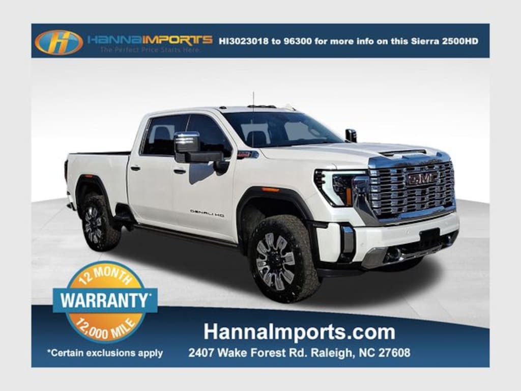 Why shop with Hanna Imports? We specialize in hand-selecting top-quality used cars, trucks, and SUVs for drivers across Raleigh, Durham, Cary, Chapel Hill, and the greater Triangle area of North Carolina. Our massive selection of 1,000+ vehicles on our Raleigh lot is carefully curated to include the most sought-after models, all priced below market value. We believe in transparency and efficiencyâ"our vehicles are aggressively priced from the start, which means no haggling, no hassle, and no wasted time. The price you see is our absolute best price. Whether you're coming from Wake Forest, Apex, Garner, or anywhere in central NC, weâre committed to making your car-buying experience smooth, affordable, and enjoyable. Come see why Hanna Imports is one of the most trusted used car dealerships in North Carolina! Used GMC Sierra 2500HD in Raleigh. Used GMC Sierra 2500HD in North Carolina, Denali Reserve Package (Power Sunroof), Technology Package (Adaptive Cruise Control, Inside Rearview Auto-Dimming Rear Camera Mirror, and Multicolor 15" Diagonal Head-Up Display), X31 Off-Road Package (Hill Descent Control), Preferred Equipment Group 5SA (120-Volt Bed Mounted Power Outlet, 120-Volt Instrument Panel Power Outlet, 2 Charge-Only Rear USB Ports, 2 Charge/Data USB Ports Inside Center Console, 2 USB Ports, 2-Speed Active Transfer Case, Bed View Camera w/2 Trailer Camera Provisions, Bose Premium 7-Speaker Sound System, Deep-Tinted Glass, Electric Rear-Window Defogger, Floor-Mounted Center Console, Front Rain-Sensing Wipers, GMC Connected Access Capable, HD Surround Vision, Heated 2nd Row Outboard Seats, Heated Driver & Front Outboard Passenger Seats, Integrated Trailer Brake Controller, Keyless Open & Start, LED Cargo Area Lighting, LED Smoked Amber Roof Marker Lamps, Manual Tilt-Wheel/Telescoping Steering Column, OnStar & GMC Connected Services Capable, Polished Exhaust Tip, Power Front Passenger Windows w/Express Up/Down, Power Sliding Rear Window w/Defogger, Push Button Start, Rear Cross Traffic Alert, Rear Wheelhouse Liners, Remote Vehicle Starter System, Safety Alert Seat, Signature Chrome Denali Grille, SiriusXM w/360L, Spray-On Bedliner w/Denali Logo, Steering Wheel Audio Controls, Trailer Cam Provisions & Trailer Viewing Software, Trailer Side Blind Zone Alert, Ultrasonic Front & Rear Park Assist, Unauthorized Entry Theft-Deterrent System, Universal Home Remote, Ventilated Driver & Front Passenger Seats, Wireless Charging, and Wireless Phone Projection), Sierra 2500HD Denali, Duramax 6.6L V8 Turbodiesel, 10-Speed Automatic, 4WD, Jet Black Leather, 12-Way Power Driver Seat Adjuster w/Lumbar, 12-Way Power Passenger Seat Adjuster w/Lumbar, 220-Amp Alternator, 4-Wheel Disc Brakes, 7 Speakers, ABS brakes, Air Conditioning, Alloy wheels, AM/FM radio: SiriusXM with 360L, Apple CarPlay/Android Auto, Auto High-beam Headlights, Auto-dimming door mirrors, Auto-dimming Rear-View mirror, Automatic Emergency Braking, Automatic temperature control, Brake assist, Buckle to Drive, Bumpers: body-color, Compass, Delay-off headlights, Driver door bin, Driver Memory, Driver vanity mirror, Dual front impact airbags, Dual front side impact airbags, Electronic Stability Control, Emergency communication system: OnStar and GMC connected services capable, Engine Block Heater, Exhaust Brake, Following Distance Indicator, Forge Perforated Leather-Appointed Front Seat Trim, Forward Collision Alert, Front anti-roll bar, Front Bucket Seats, Front Center Armrest, Front dual zone A/C, Front fog lights, Front License Plate Kit, Front Pedestrian Braking, Front reading lights, Front wheel independent suspension, Fully automatic headlights, Garage