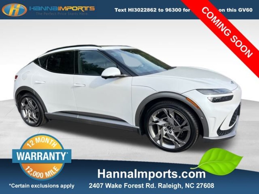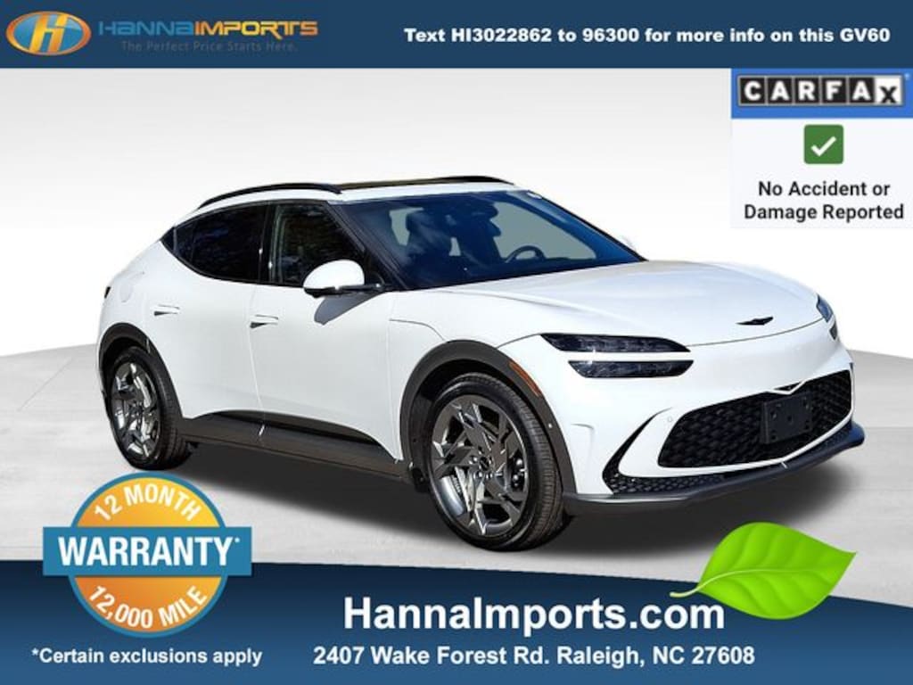 Why shop with Hanna Imports? We specialize in hand-selecting top-quality used cars, trucks, and SUVs for drivers across Raleigh, Durham, Cary, Chapel Hill, and the greater Triangle area of North Carolina. Our massive selection of 1,000+ vehicles on our Raleigh lot is carefully curated to include the most sought-after models, all priced below market value. We believe in transparency and efficiencyâ"our vehicles are aggressively priced from the start, which means no haggling, no hassle, and no wasted time. The price you see is our absolute best price. Whether you're coming from Wake Forest, Apex, Garner, or anywhere in central NC, weâre committed to making your car-buying experience smooth, affordable, and enjoyable. Come see why Hanna Imports is one of the most trusted used car dealerships in North Carolina! Used Genesis GV60 in Raleigh. Used Genesis GV60 in North Carolina, Option Group 01, Protection Package, GV60 Performance, AWD, Obsidian Black Leather, Android Auto & Apple CarPlay, Exterior Parking Camera Rear, Heads-Up Display, Heated front seats, Heated rear seats, Heated steering wheel, Navigation System, Power Liftgate, Remote keyless entry, Ventilated front seats, 10.650 Axle Ratio, 17 Speakers, 4-Wheel Disc Brakes, ABS brakes, Adaptive suspension, Air Conditioning, Alloy wheels, AM/FM radio: SiriusXM, Anti-whiplash front head restraints, Auto High-beam Headlights, Auto tilt-away steering wheel, Auto-dimming door mirrors, Auto-dimming Rear-View mirror, Automatic temperature control, Brake assist, Bumpers: body-color, Delay-off headlights, Driver door bin, Driver vanity mirror, Dual front impact airbags, Dual front side impact airbags, Electronic Stability Control, Emergency communication system: Genesis Connected Services, First Aid Kit, Four wheel independent suspension, Front anti-roll bar, Front Bucket Seats, Front Center Armrest, Front dual zone A/C, Front reading lights, Fully automatic headlights, Garage door transmitter: HomeLink, Heated & Ventilated Front Seats w/Memory, Heated door mirrors, Illuminated entry, Knee airbag, Leather steering wheel, Low tire pressure warning, Memory seat, Nappa Leather Seating Surfaces, Occupant sensing airbag, Outside temperature display, Overhead airbag, Overhead console, Panic alarm, Passenger door bin, Passenger vanity mirror, Power door mirrors, Power driver seat, Power passenger seat, Power steering, Power windows, Radio: AM/FM/HD Bang & Olufsen Premium Audio System, Rain sensing wipers, Rear anti-roll bar, Rear reading lights, Rear seat center armrest, Rear side impact airbag, Rear window defroster, Security system, Speed control, Speed-sensing steering, Split folding rear seat, Spoiler, Steering wheel memory, Steering wheel mounted audio controls, Telescoping steering wheel, Tilt steering wheel, Traction control, Trip computer, Turn signal indicator mirrors, Variably intermittent wipers, and Wheels: 21" x 8.5J Alloy.
