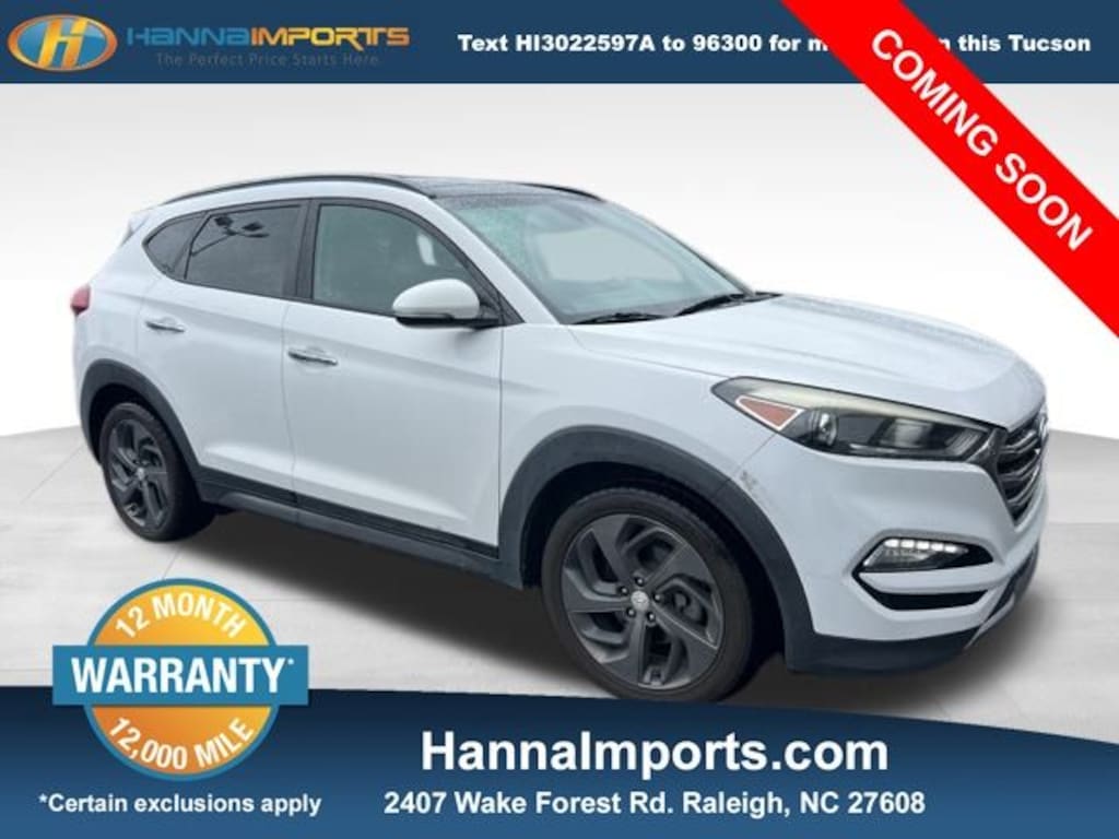 Why shop with Hanna Imports? We specialize in hand-selecting top-quality used cars, trucks, and SUVs for drivers across Raleigh, Durham, Cary, Chapel Hill, and the greater Triangle area of North Carolina. Our massive selection of 1,000+ vehicles on our Raleigh lot is carefully curated to include the most sought-after models, all priced below market value. We believe in transparency and efficiencyâ"our vehicles are aggressively priced from the start, which means no haggling, no hassle, and no wasted time. The price you see is our absolute best price. Whether you're coming from Wake Forest, Apex, Garner, or anywhere in central NC, weâre committed to making your car-buying experience smooth, affordable, and enjoyable. Come see why Hanna Imports is one of the most trusted used car dealerships in North Carolina! Used Hyundai Tucson in Raleigh. Used Hyundai Tucson in North Carolina, Limited Ultimate Package 03 (4.2-Inch Color LCD Electroluminescent Cluster, Automatic Emergency Braking (AEB), Front & Rear LED Maplights, Heated Rear Seats, High-Intensity Discharge Headlights, Lane Departure Warning System, Panoramic Sunroof, Rear Parking Sensors, and Ventilated Front Bucket Seats), Option Group 03, Tucson Limited, Exterior Parking Camera Rear, Power Liftgate, 3.579 Axle Ratio, 4-Wheel Disc Brakes, 8 Speakers, ABS brakes, Air Conditioning, Alloy wheels, AM/FM radio: SiriusXM, Anti-whiplash front head restraints, Auto-dimming Rear-View mirror, Automatic temperature control, Brake assist, Bumpers: body-color, Compass, Delay-off headlights, Driver door bin, Driver vanity mirror, Dual front impact airbags, Dual front side impact airbags, Electronic Stability Control, Emergency communication system: Blue Link, Four wheel independent suspension, Front anti-roll bar, Front Bucket Seats, Front Center Armrest, Front dual zone A/C, Front fog lights, Front reading lights, Fully automatic headlights, Garage door transmitter: HomeLink, Heated door mirrors, Heated Front Bucket Seats w/Power Driver, Heated front seats, Illuminated entry, Leather Seat Trim, Leather Shift Knob, Low tire pressure warning, Occupant sensing airbag, Outside temperature display, Overhead airbag, Overhead console, Panic alarm, Passenger door bin, Passenger vanity mirror, Power door mirrors, Power driver seat, Power passenger seat, Power steering, Power windows, Radio: Autonet AM/FM/HD Radio/MP3 Audio System, Rear anti-roll bar, Rear seat center armrest, Rear window defroster, Rear window wiper, Remote keyless entry, Roof rack: rails only, Security system, Speed control, Speed-sensing steering, Split folding rear seat, Spoiler, Steering wheel mounted audio controls, Tachometer, Telescoping steering wheel, Tilt steering wheel, Traction control, Trip computer, Turn signal indicator mirrors, Variably intermittent wipers, and Wheels: 19 x 7.5J Alloys.