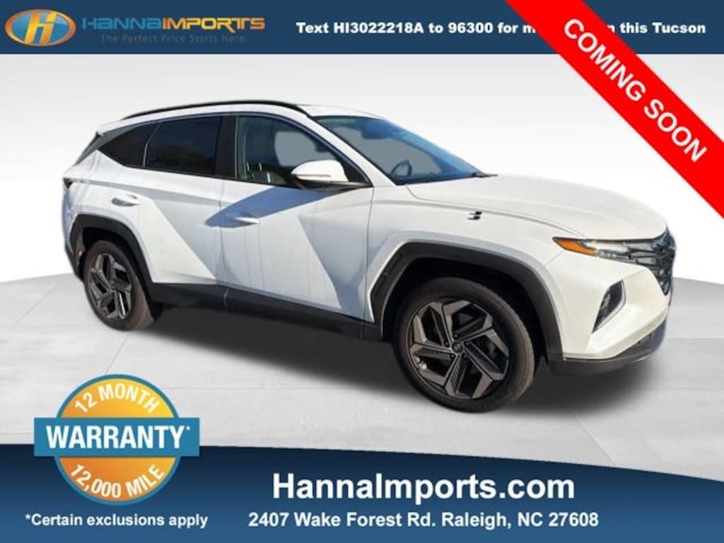 Why shop with Hanna Imports? We specialize in hand-selecting top-quality used cars, trucks, and SUVs for drivers across Raleigh, Durham, Cary, Chapel Hill, and the greater Triangle area of North Carolina. Our massive selection of 1,000+ vehicles on our Raleigh lot is carefully curated to include the most sought-after models, all priced below market value. We believe in transparency and efficiencyâ"our vehicles are aggressively priced from the start, which means no haggling, no hassle, and no wasted time. The price you see is our absolute best price. Whether you're coming from Wake Forest, Apex, Garner, or anywhere in central NC, weâre committed to making your car-buying experience smooth, affordable, and enjoyable. Come see why Hanna Imports is one of the most trusted used car dealerships in North Carolina! Used Hyundai Tucson in Raleigh. Used Hyundai Tucson in North Carolina, Convenience + Premium Package (Option Group 02, Option Group 03, Power Sunroof, 10.25" Digital Instrument Cluster, Auto-Dimming Interior Mirror w/Homelink, Dark Chrome Grille & H-Logo, Digital Key, Dual Automatic Temperature Control, Hands-Free Power Liftgate w/Auto-Open, Leather Seat Trim, Leather-Wrapped Shift Knob, Leather-Wrapped Steering Wheel, LED Interior Lights (Room, Map), Premium 5-LED DRLs, Radio: Bose Premium Audio System w/AM/FM/HD, Ultrasonic Rear Occupant Alert, Ventilated Front Seats, Wheels: 19" x 7.5J" Machine-Face Finish Alloy, and Wireless Phone Charging), Tucson SEL, AWD, Apple CarPlay & Android Auto, 3.648 Axle Ratio, 4-Wheel Disc Brakes, 6 Speakers, ABS brakes, Air Conditioning, Alloy wheels, AM/FM radio: SiriusXM, Auto High-beam Headlights, Brake assist, Bumpers: body-color, Cargo Cover, Cargo Net, Cargo Tray, Carpeted Floor Mats, Delay-off headlights, Driver door bin, Driver vanity mirror, Dual front impact airbags, Dual front side impact airbags, Electronic Stability Control, Emergency communication system: Blue Link Connected Car Service (3-year complimentary subscription), Four wheel independent suspension, Front anti-roll bar, Front Bucket Seats, Front Center Armrest, Front reading lights, Fully automatic headlights, Heated door mirrors, Heated Front Bucket Seats, Heated front seats, Illuminated entry, Low tire pressure warning, Occupant sensing airbag, Outside temperature display, Overhead airbag, Overhead console, Panic alarm, Passenger door bin, Passenger vanity mirror, Power door mirrors, Power driver seat, Power steering, Power windows, Radio data system, Radio: AM/FM/HD/SiriusXM Audio System, Rear anti-roll bar, Rear seat center armrest, Rear window defroster, Rear window wiper, Remote keyless entry, Roof rack: rails only, Security system, Speed control, Split folding rear seat, Spoiler, Stain & Odor Resistant Cloth Seat Trim, Steering wheel mounted audio controls, Tachometer, Telescoping steering wheel, Tilt steering wheel, Traction control, Trip computer, Turn signal indicator mirrors, Variably intermittent wipers, and Wheels: 17" x 7.0J" Alloy.