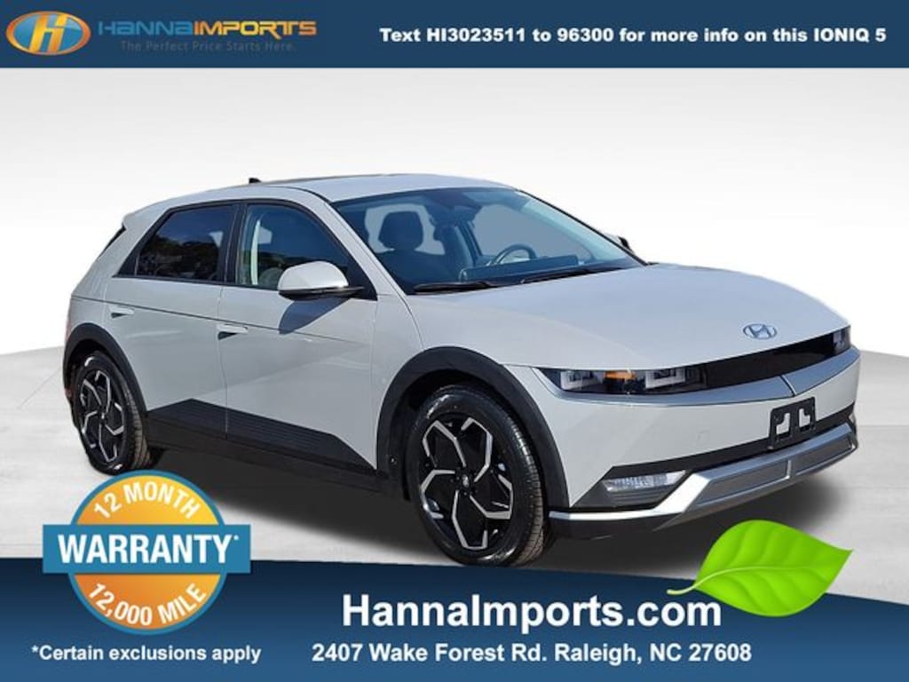 Why shop with Hanna Imports? We specialize in hand-selecting top-quality used cars, trucks, and SUVs for drivers across Raleigh, Durham, Cary, Chapel Hill, and the greater Triangle area of North Carolina. Our massive selection of 1,000+ vehicles on our Raleigh lot is carefully curated to include the most sought-after models, all priced below market value. We believe in transparency and efficiencyâ"our vehicles are aggressively priced from the start, which means no haggling, no hassle, and no wasted time. The price you see is our absolute best price. Whether you're coming from Wake Forest, Apex, Garner, or anywhere in central NC, weâre committed to making your car-buying experience smooth, affordable, and enjoyable. Come see why Hanna Imports is one of the most trusted used car dealerships in North Carolina! Used Hyundai IONIQ 5 in Raleigh. Used Hyundai IONIQ 5 in North Carolina, Option Group 01, IONIQ 5 SE Standard Range, Heated Front Bucket Seats, Navigation System, Remote keyless entry, Steering wheel mounted audio controls, 4-Wheel Disc Brakes, 4.71 Axle Ratio, 6 Speakers, ABS brakes, Air Conditioning, Alloy wheels, AM/FM radio: SiriusXM, Apple CarPlay & Android Auto, Auto High-beam Headlights, Automatic temperature control, Bodyside moldings, Brake assist, Bumpers: body-color, Cargo Mat, Up Seatback, Cargo Net, Charging Port Applique, Delay-off headlights, Driver door bin, Driver vanity mirror, Dual front impact airbags, Dual front side impact airbags, Electronic Stability Control, Emergency communication system: Bluelink+, First Aid Kit, Four wheel independent suspension, Front anti-roll bar, Front Bucket Seats, Front Center Armrest w/Storage, Front dual zone A/C, Front reading lights, Fully automatic headlights, harman/kardon® Speakers, Heated door mirrors, Heated front seats, Illuminated entry, Leather steering wheel, Low tire pressure warning, Mudguards, Occupant sensing airbag, Outside temperature display, Overhead airbag, Overhead console, Panic alarm, Passenger door bin, Passenger vanity mirror, Power door mirrors, Power driver seat, Power steering, Power windows, Radio: AM/FM/SiriusXM/HD Display Audio System, Rear anti-roll bar, Rear reading lights, Rear side impact airbag, Rear window defroster, Security system, Speed control, Speed-sensing steering, Split folding rear seat, Spoiler, Stain-Resistant Cloth Seating Surfaces, Telescoping steering wheel, Tilt steering wheel, Traction control, Trip computer, Turn signal indicator mirrors, Variably intermittent wipers, Wheel Locks, and Wheels: 19" x 7.5J Aero Alloy.