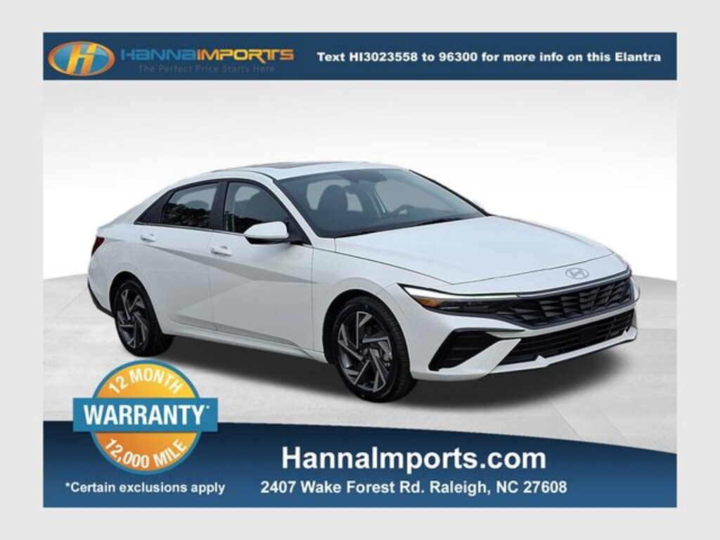 Why shop with Hanna Imports? We specialize in hand-selecting top-quality used cars, trucks, and SUVs for drivers across Raleigh, Durham, Cary, Chapel Hill, and the greater Triangle area of North Carolina. Our massive selection of 1,000+ vehicles on our Raleigh lot is carefully curated to include the most sought-after models, all priced below market value. We believe in transparency and efficiencyâ"our vehicles are aggressively priced from the start, which means no haggling, no hassle, and no wasted time. The price you see is our absolute best price. Whether you're coming from Wake Forest, Apex, Garner, or anywhere in central NC, weâre committed to making your car-buying experience smooth, affordable, and enjoyable. Come see why Hanna Imports is one of the most trusted used car dealerships in North Carolina! Used Hyundai Elantra in Raleigh. Used Hyundai Elantra in North Carolina, Option Group 01, Elantra SEL Convenience, Apple CarPlay & Android Auto, Exterior Parking Camera Rear, Navigation System, Power moonroof, Remote keyless entry, 17" x 7.0J Alloy Wheels, 4-Wheel Disc Brakes, 6 Speakers, ABS brakes, Air Conditioning, Alloy wheels, AM/FM radio: SiriusXM, Auto High-beam Headlights, Automatic temperature control, Brake assist, Bumpers: body-color, Delay-off headlights, Driver door bin, Driver vanity mirror, Dual front impact airbags, Dual front side impact airbags, Electronic Stability Control, Emergency communication system: Bluelink+, Front anti-roll bar, Front Bucket Seats, Front Center Armrest, Front dual zone A/C, Front reading lights, Front wheel independent suspension, Fully automatic headlights, Heated door mirrors, Heated Front Bucket Seats, Heated front seats, Illuminated entry, Leather Shift Knob, Leather steering wheel, Low tire pressure warning, Occupant sensing airbag, Outside temperature display, Overhead airbag, Overhead console, Panic alarm, Passenger door bin, Passenger vanity mirror, Power door mirrors, Power steering, Power windows, Premium Cloth Seat Trim, Radio: AM/FM/HD/SiriusXM Display Audio, Rear seat center armrest, Rear side impact airbag, Rear window defroster, Security system, Speed control, Speed-sensing steering, Split folding rear seat, Steering wheel mounted audio controls, Tachometer, Telescoping steering wheel, Tilt steering wheel, Traction control, Trip computer, and Variably intermittent wipers.