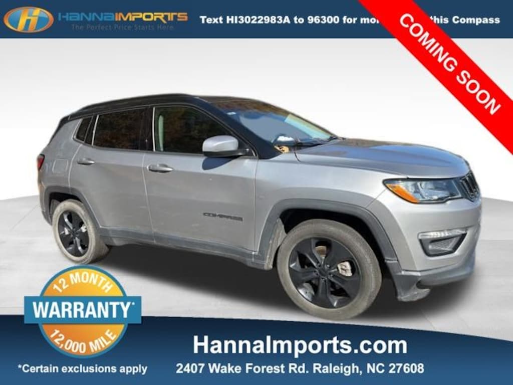 Why shop with Hanna Imports? We specialize in hand-selecting top-quality used cars, trucks, and SUVs for drivers across Raleigh, Durham, Cary, Chapel Hill, and the greater Triangle area of North Carolina. Our massive selection of 1,000+ vehicles on our Raleigh lot is carefully curated to include the most sought-after models, all priced below market value. We believe in transparency and efficiencyâ"our vehicles are aggressively priced from the start, which means no haggling, no hassle, and no wasted time. The price you see is our absolute best price. Whether you're coming from Wake Forest, Apex, Garner, or anywhere in central NC, weâre committed to making your car-buying experience smooth, affordable, and enjoyable. Come see why Hanna Imports is one of the most trusted used car dealerships in North Carolina! Used Jeep Compass in Raleigh. Used Jeep Compass in North Carolina, Popular Equipment Group (115V Auxiliary Power Outlet, 7.0" Touch Screen Display, Auto-Dimming Rear-View Mirror, Cluster 7.0" Color Driver Info Display, Power 8-Way Driver/Manual 6-Way Passenger Seats, Remote Start System, and 4-Way Power Lumbar Adjust), Quick Order Package 28B Altitude (Altitude Special Edition, Black Day Light Opening Moldings, Black Grille w/Black Rings, Black Roof, Bright Exhaust Tip, Gloss Black Compass Badge, Gloss Black Fog Lamp Bezels, Gloss Black Jeep Badge, Gloss Black Lower Rear Fascia Valance, Piano Black Interior Accents, and Wheels: 18" x 7.0" Black Aluminum), Compass Altitude, ParkView Rear Back-Up Camera, Power Front/Fixed Rear Full Sunroof, 3.502 Axle Ratio, 4-Wheel Disc Brakes, 6 Speakers, ABS brakes, Air Conditioning, Alloy wheels, AM/FM radio, Anti-whiplash front head restraints, Brake assist, Bumpers: body-color, Compass, Delay-off headlights, Driver door bin, Driver vanity mirror, Dual front impact airbags, Dual front side impact airbags, Electronic Stability Control, Four wheel independent suspension, Front anti-roll bar, Front Bucket Seats, Front Center Armrest w/Storage, Front fog lights, Front reading lights, Fully automatic headlights, Heated door mirrors, Illuminated entry, Knee airbag, Leather Shift Knob, Low tire pressure warning, Occupant sensing airbag, Outside temperature display, Overhead airbag, Overhead console, Panic alarm, Passenger door bin, Passenger vanity mirror, Power door mirrors, Power steering, Power windows, Premium Cloth/Vinyl Bucket Seats, Radio: Uconnect 3 w/5" Display, Radio: Uconnect 4 w/7" Display, Rear anti-roll bar, Rear seat center armrest, Rear window defroster, Rear window wiper, Remote keyless entry, Roof rack: rails only, Speed control, Split folding rear seat, Spoiler, Steering wheel mounted audio controls, Tachometer, Telescoping steering wheel, Tilt steering wheel, Traction control, Trip computer, Variably intermittent wipers, and Wheels: 17" x 7.0" Silver Painted Aluminum.