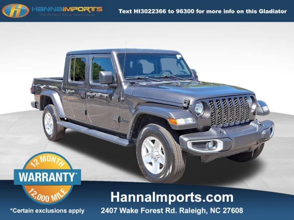 Why shop with Hanna Imports? We specialize in hand-selecting top-quality used cars, trucks, and SUVs for drivers across Raleigh, Durham, Cary, Chapel Hill, and the greater Triangle area of North Carolina. Our massive selection of 1,000+ vehicles on our Raleigh lot is carefully curated to include the most sought-after models, all priced below market value. We believe in transparency and efficiencyâ"our vehicles are aggressively priced from the start, which means no haggling, no hassle, and no wasted time. The price you see is our absolute best price. Whether you're coming from Wake Forest, Apex, Garner, or anywhere in central NC, weâre committed to making your car-buying experience smooth, affordable, and enjoyable. Come see why Hanna Imports is one of the most trusted used car dealerships in North Carolina! Used Jeep Gladiator in Raleigh. Used Jeep Gladiator in North Carolina, Convenience Group (Daytime Running Lamp System and Universal Garage Door Opener), Popular Equipment Package (Black 3-Piece Hard Top, Freedom Panel Storage Bag, Rear Sliding Window, and Rear Window Defroster), Quick Order Package 24S Sport S (Automatic Headlamps, Deep Tint Sunscreen Windows, Front 1-Touch Down Power Windows, Normal Duty Plus Suspension, Power Heated Mirrors, Power Tailgate Lock, Premium Wrapped Steering Wheel, Remote Keyless Entry, Security Alarm, Speed Sensitive Power Locks, Sport S, Sun Visors w/Illuminated Vanity Mirrors, and Wheels: 17" x 7.5 Tech Silver Aluminum), Trailer Tow Package (240 Amp Alternator, Class IV Receiver Hitch, Heavy-Duty Engine Cooling, and Trailer Hitch Zoom), Gladiator Sport, Mopar Black Tubular Side Steps, ParkView Rear Back-Up Camera, 3.73 Rear Axle Ratio, 4-Wheel Disc Brakes, 4G LTE Wi-Fi Hot Spot, 8 Speakers, ABS brakes, Air Conditioning, AM/FM radio, Apple CarPlay, Apple CarPlay/Android Auto, Brake assist, Cloth Low-Back Bucket Seats, Compass, Delay-off headlights, Driver door bin, Driver vanity mirror, Dual front impact airbags, Dual front side impact airbags, Electronic Stability Control, Emergency communication system, Front anti-roll bar, Front Bucket Seats, Front Center Armrest w/Storage, Front fog lights, Front License Plate Bracket, Front reading lights, Google Android Auto, GPS Antenna Input, Integrated Center Stack Radio, Integrated roll-over protection, Integrated Voice Command w/Bluetooth, Low tire pressure warning, MOPAR Spray In Bedliner, Normal Duty Suspension, Occupant sensing airbag, Outside temperature display, Passenger door bin, Passenger vanity mirror, Power steering, Radio data system, Radio: Uconnect 4 w/7" Display, Rear anti-roll bar, Rear reading lights, Speed control, Split folding rear seat, Steering wheel mounted audio controls, Tachometer, Telescoping steering wheel, Tilt steering wheel, Traction control, Trip computer, USB Host Flip, Variably intermittent wipers, Wheels: 17" x 7.5" Black Steel Styled, and Wheels: 17" x 7.5" Tech Silver Aluminum (DISC)
