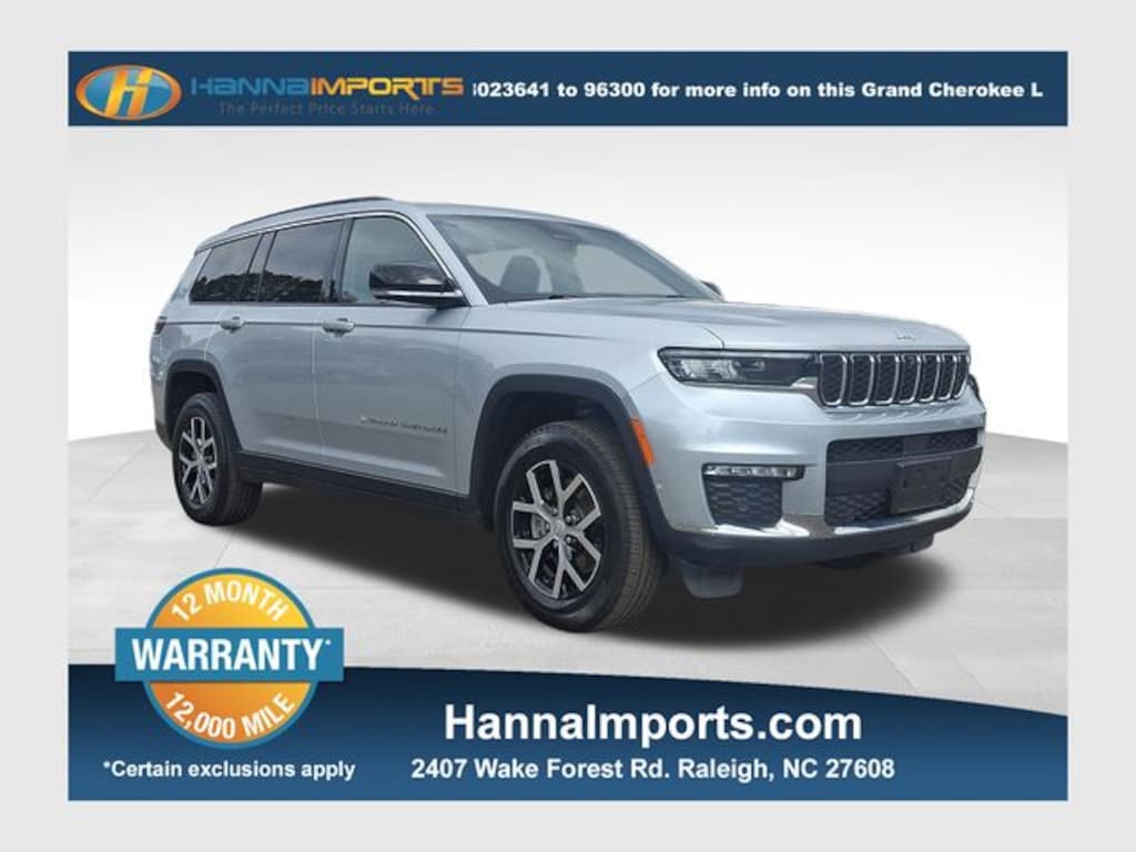 Why shop with Hanna Imports? We specialize in hand-selecting top-quality used cars, trucks, and SUVs for drivers across Raleigh, Durham, Cary, Chapel Hill, and the greater Triangle area of North Carolina. Our massive selection of 1,000+ vehicles on our Raleigh lot is carefully curated to include the most sought-after models, all priced below market value. We believe in transparency and efficiencyâ"our vehicles are aggressively priced from the start, which means no haggling, no hassle, and no wasted time. The price you see is our absolute best price. Whether you're coming from Wake Forest, Apex, Garner, or anywhere in central NC, weâre committed to making your car-buying experience smooth, affordable, and enjoyable. Come see why Hanna Imports is one of the most trusted used car dealerships in North Carolina! Used Jeep Grand Cherokee L in Raleigh. Used Jeep Grand Cherokee L in North Carolina, Luxury Tech Group II (2nd Row Manual Window Shades, Auto-Dimming Exterior Driver Mirror, Capri Leatherette w/Axis II Seats, Integrated Off-Road Camera, Intersection Collision Assist System, Memory Steering Column, ParkSense Front/Rear Park Assist w/Stop, Passive Entry - Front/Rear Doors, Liftgate, Power Tilt/Telescope Steering Column, Rain Sensitive Windshield Wipers, Rear Back Up Camera Washer, Rearview Autodim Digital Display Mirror, Surround View Camera System, Ventilated Front Seats, and Wireless Charging Pad), Quick Order Package 23E, Grand Cherokee L Limited, Dual-Pane Panoramic Sunroof, Interior Rear Facing Camera, Navigation System, ParkView Rear Back-Up Camera, Power Liftgate, Remote keyless entry, 3.45 Rear Axle Ratio, 3rd row seats: split-bench, 4-Wheel Disc Brakes, 6 Speakers, ABS brakes, Active Noise Control System, Air Conditioning, Alloy wheels, AM/FM radio: SiriusXM with 360L, Anti-whiplash front head restraints, Audio memory, Auto High-beam Headlights, Automatic temperature control, Brake assist, Bumpers: body-color, Capri Leatherette Seats, Compass, Delay-off headlights, Driver door bin, Driver vanity mirror, Dual front impact airbags, Dual front side impact airbags, Electronic Stability Control, Emergency communication system, Four wheel independent suspension, Front anti-roll bar, Front Bucket Seats, Front Center Armrest w/Storage, Front dual zone A/C, Front fog lights, Front License Plate Bracket, Front reading lights, Fully automatic headlights, Garage door transmitter, Heated door mirrors, Heated front seats, Heated rear seats, Heated steering wheel, Illuminated entry, Knee airbag, Low tire pressure warning, Manual Fold Seatbacks, Memory seat, Normal Duty Suspension, Occupant sensing airbag, Outside temperature display, Overhead airbag, Overhead console, Panic alarm, Passenger door bin, Passenger vanity mirror, Power door mirrors, Power driver seat, Power passenger seat, Power steering, Power windows, Radio data system, Radio: Uconnect 5 Nav w/10.1" Display, Rear air conditioning, Rear anti-roll bar, Rear reading lights, Rear window defroster, Rear window wiper, Reclining 3rd row seat, Security system, Speed control, Speed-Sensitive Wipers, Split folding rea