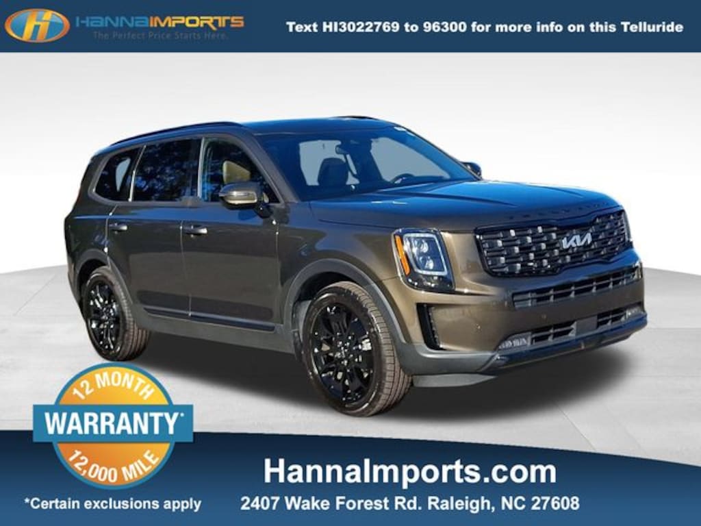 Why shop with Hanna Imports? We specialize in hand-selecting top-quality used cars, trucks, and SUVs for drivers across Raleigh, Durham, Cary, Chapel Hill, and the greater Triangle area of North Carolina. Our massive selection of 1,000+ vehicles on our Raleigh lot is carefully curated to include the most sought-after models, all priced below market value. We believe in transparency and efficiencyâ"our vehicles are aggressively priced from the start, which means no haggling, no hassle, and no wasted time. The price you see is our absolute best price. Whether you're coming from Wake Forest, Apex, Garner, or anywhere in central NC, weâre committed to making your car-buying experience smooth, affordable, and enjoyable. Come see why Hanna Imports is one of the most trusted used car dealerships in North Carolina! Used Kia Telluride in Raleigh. Used Kia Telluride in North Carolina, Nightfall Edition Package (Black Finish Radiator Grille, Body Color Exterior Door Handles, Exclusive Black Fog Light Bezel, Exclusive Black Headlight Bezels, Front & Rear Gloss Black Finish Bumper Skid Plates, Gloss Black Finish Exterior Emblems, Gloss Black Finish Front & Rear Door Garnish, Gloss Black Finish Roof Rails, and Wheels: 20" x 7.5" Exclusive Black Alloy), SX Prestige Package (110V Inverter, Heads-Up Display, Heated & Ventilated 2nd Row Seats, Premium Cloth Headliner & Pillar Trim, Premium Nappa Leather Seat Trim, and Rain-Sensing Front Windshield Wipers), Towing Package (Self Leveling Rear Suspension and Tow Hitch w/Harness (TOF)), Telluride SX, AWD, Apple CarPlay & Android Auto, Navigation System, Power Liftgate, Power moonroof, 10 Speakers, 3.648 Axle Ratio, 3rd row seats: split-bench, 4-Wheel Disc Brakes, ABS brakes, Air Conditioning, Alloy wheels, AM/FM radio: SiriusXM, Auto High-beam Headlights, Auto-dimming Rear-View mirror, Automatic temperature control, Brake assist, Bumpers: body-color, Compass, Cross Bars, Delay-off headlights, Driver door bin, Driver vanity mirror, Dual front impact airbags, Dual front side impact airbags, Electronic Stability Control, Emergency communication system: 911 Connect, Four wheel independent suspension, Front anti-roll bar, Front Bucket Seats, Front Center Armrest, Front dual zone A/C, Front fog lights, Front reading lights, Fully automatic headlights, Garage door transmitter: HomeLink, harman/kardon® Speakers, Heated & Ventilated Front Bucket Seats, Heated door mirrors, Heated front seats, Heated steering wheel, Illuminated entry, Knee airbag, Leather Seat Trim, Leather Shift Knob, Leather steering wheel, Low tire pressure warning, Memory seat, Occupant sensing airbag, Outside temperature display, Overhead airbag, Overhead console, Panic alarm, Passenger door bin, Passenger vanity mirror, Power door mirrors, Power driver seat, Power passenger seat, Power steering, Power windows, Radio data system, Radio: AM/FM harman/kardon Audio System, Rear air conditioning, Rear anti-roll bar, Rear audio controls, Rear reading lights, Rear window defroster, Rear window wiper, Reclining 3rd row seat, Remote keyless entry, Roof rack: rails only, Security system, Smart Key w/ Push Butto