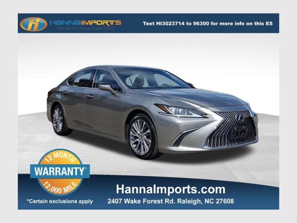 Why shop with Hanna Imports? We specialize in hand-selecting top-quality used cars, trucks, and SUVs for drivers across Raleigh, Durham, Cary, Chapel Hill, and the greater Triangle area of North Carolina. Our massive selection of 1,000+ vehicles on our Raleigh lot is carefully curated to include the most sought-after models, all priced below market value. We believe in transparency and efficiencyâ"our vehicles are aggressively priced from the start, which means no haggling, no hassle, and no wasted time. The price you see is our absolute best price. Whether you're coming from Wake Forest, Apex, Garner, or anywhere in central NC, weâre committed to making your car-buying experience smooth, affordable, and enjoyable. Come see why Hanna Imports is one of the most trusted used car dealerships in North Carolina! Used Lexus ES in Raleigh. Used Lexus ES in North Carolina, Accessory Package 2 (PPO) (Alloy Wheel Locks, Cargo Net (PPO), Carpet Trunk Mat (PPO), Key Gloves (PPO), and Rear Bumper Applique), Premium Package (Heated & Ventilated Seats, Perforated NuLuxe Seat Trim (LD), Power Tilt/Telescoping Steering Wheel w/Memory, and Rain Sensing Wipers), Flaxen w/Linear Espresso Wood Trim w/Perforated Leather Seat Trim, Apple CarPlay/Android Auto, Blind Spot Monitor, Electrochromic Rear-View Mirror, Exterior Parking Camera Rear, Heated Leather & Wood Steering Wheel, Lane Change Assist & Rear Cross-Traffic Alert, Navigation, Navigation System, Power moonroof, Windshield De-Icer, 10 Speakers, 10-Way Power Adjustable Front Seats, 4-Wheel Disc Brakes, ABS brakes, Air Conditioning, All-Weather Floor Liners w/Trunk Tray (PPO), AM/FM radio: SiriusXM, Auto Braking Protection, Auto High-beam Headlights, Auto-dimming door mirrors, Auto-dimming Rear-View mirror, Automatic temperature control, Blind Spot Monitor w/Park Assist, Brake assist, Bumpers: body-color, CD player, Compass, Delay-off headlights, Driver door bin, Driver vanity mirror, Dual front impact airbags, Dual front side impact airbags, Electronic Stability Control, Emergency communication system, Four wheel independent suspension, Front anti-roll bar, Front Bucket Seats, Front Center Armrest, Front dual zone A/C, Front reading lights, Fully automatic headlights, Garage door transmitter: HomeLink, Illuminated entry, Intelligent Clearance Sonar, Knee airbag, Leather Shift Knob, Leather steering wheel, Low tire pressure warning, Occupant sensing airbag, Outside temperature display, Overhead airbag, Overhead console, Panic alarm, Passenger door bin, Passenger vanity mirror, Perforated NuLuxe Seat Trim, Power door mirrors, Power driver seat, Power passenger seat, Power steering, Power windows, Radio data system, Radio: Multimedia System w/8" Color Display, Rear anti-roll bar, Rear Pedestrian Detection, Rear reading lights, Rear seat center armrest, Rear side impact airbag, Rear window defroster, Remote keyless entry, Security system, Speed control, Speed-sensing steering, Steering wheel mounted audio controls, Tachometer, Telescoping steering wheel, Tilt steering wheel, Traction control, Trip computer, Turn signal indicator mirrors, Variably intermittent wipers, Wheels: 18" x 8J Split 10-Spoke High Gloss, and Wood Trim (XG)
