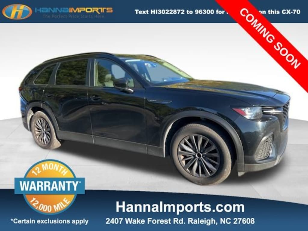 Why shop with Hanna Imports? We specialize in hand-selecting top-quality used cars, trucks, and SUVs for drivers across Raleigh, Durham, Cary, Chapel Hill, and the greater Triangle area of North Carolina. Our massive selection of 1,000+ vehicles on our Raleigh lot is carefully curated to include the most sought-after models, all priced below market value. We believe in transparency and efficiencyâ"our vehicles are aggressively priced from the start, which means no haggling, no hassle, and no wasted time. The price you see is our absolute best price. Whether you're coming from Wake Forest, Apex, Garner, or anywhere in central NC, weâre committed to making your car-buying experience smooth, affordable, and enjoyable. Come see why Hanna Imports is one of the most trusted used car dealerships in North Carolina! Used Mazda CX-70 in Raleigh. Used Mazda CX-70 in North Carolina, I6 Turbo, AWD, Jet Black Mica, AppLink/Apple CarPlay and Android Auto, Heated front seats, Leather Seat Trim, Power Liftgate, Power moonroof, 4-Wheel Disc Brakes, 8 Speakers, ABS brakes, Air Conditioning, Alloy wheels, AM/FM radio, Auto High-beam Headlights, Automatic temperature control, Brake assist, Bumpers: body-color, Compass, Delay-off headlights, Driver door bin, Driver vanity mirror, Dual front impact airbags, Dual front side impact airbags, E911 Automatic Emergency Notification, Electronic Stability Control, Emergency communication system: MAZDA CONNECT, Exterior Parking Camera Rear, Four wheel independent suspension, Front anti-roll bar, Front Bucket Seats, Front Center Armrest w/Storage, Front dual zone A/C, Front reading lights, Fully automatic headlights, Heated door mirrors, Heated Front Bucket Seats, Illuminated entry, Infotainment System Voice Command, Knee airbag, Leather Shift Knob, Leather steering wheel, Low tire pressure warning, Mazda Connected Services, Occupant sensing airbag, Outside temperature display, Overhead airbag, Overhead console, Pandora Internet Radio Integration, Panic alarm, Passenger door bin, Passenger vanity mirror, Power door mirrors, Power driver seat, Power passenger seat, Power steering, Power windows, Radio Broadcast Data System Program Information, Radio data system, Radio: AM/FM Sound System, Rain sensing wipers, Rear air conditioning, Rear anti-roll bar, Rear reading lights, Rear seat center armrest, Rear window defroster, Rear window wiper, Remote keyless entry, SMS Text Msg Audio Delivery & Reply, Speed control, Speed-sensing steering, Split folding rear seat, Spoiler, Steering wheel mounted audio controls, Tachometer, Telescoping steering wheel, Tilt steering wheel, Traction control, Trip computer, Turn signal indicator mirrors, Variably intermittent wipers, and Wheels: 19" x 8.5J Aluminum Alloy.