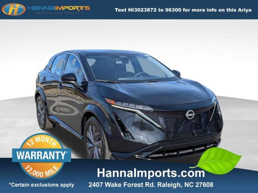 Why shop with Hanna Imports? We specialize in hand-selecting top-quality used cars, trucks, and SUVs for drivers across Raleigh, Durham, Cary, Chapel Hill, and the greater Triangle area of North Carolina. Our massive selection of 1,000+ vehicles on our Raleigh lot is carefully curated to include the most sought-after models, all priced below market value. We believe in transparency and efficiencyâ"our vehicles are aggressively priced from the start, which means no haggling, no hassle, and no wasted time. The price you see is our absolute best price. Whether you're coming from Wake Forest, Apex, Garner, or anywhere in central NC, weâre committed to making your car-buying experience smooth, affordable, and enjoyable. Come see why Hanna Imports is one of the most trusted used car dealerships in North Carolina! Used Nissan Ariya in Raleigh. Used Nissan Ariya in North Carolina, Ariya ENGAGE, Heads-Up Display, Heated front seats, Heated rear seats, Navigation system: Nissan Door to Door Connected Navigation, Remote keyless entry, 11.090 Final Drive Ratio, 19" Alloy Wheels, 4-Wheel Disc Brakes, 6 Speakers, ABS brakes, Air Conditioning, Alloy wheels, AM/FM radio: SiriusXM, Auto High-beam Headlights, Automatic temperature control, Brake assist, Bumpers: body-color, Carpeted Floor Mats & First Aid Kit, Delay-off headlights, Driver door bin, Driver vanity mirror, Dual front impact airbags, Dual front side impact airbags, Electronic Stability Control, Emergency communication system: NissanConnect EV & Services, Four wheel independent suspension, Front anti-roll bar, Front Bucket Seats, Front Center Armrest, Front dual zone A/C, Front reading lights, Heated door mirrors, Heated Front Bucket Seats, Heated steering wheel, Illuminated entry, Knee airbag, Leather steering wheel, Leatherette Seating Surfaces, Low tire pressure warning, Memory seat, Occupant sensing airbag, Outside temperature display, Overhead airbag, Panic alarm, Passenger door bin, Passenger vanity mirror, Power door mirrors, Power driver seat, Power steering, Power windows, Radio: AM/FM Audio System, Rear anti-roll bar, Rear reading lights, Rear seat center armrest, Rear side impact airbag, Rear window defroster, Rear window wiper, Security system, Speed control, Speed-sensing steering, Speed-Sensitive Wipers, Split folding rear seat, Spoiler, Steering wheel mounted audio controls, Telescoping steering wheel, Tilt steering wheel, Traction control, Trip computer, and Variably intermittent wipers.