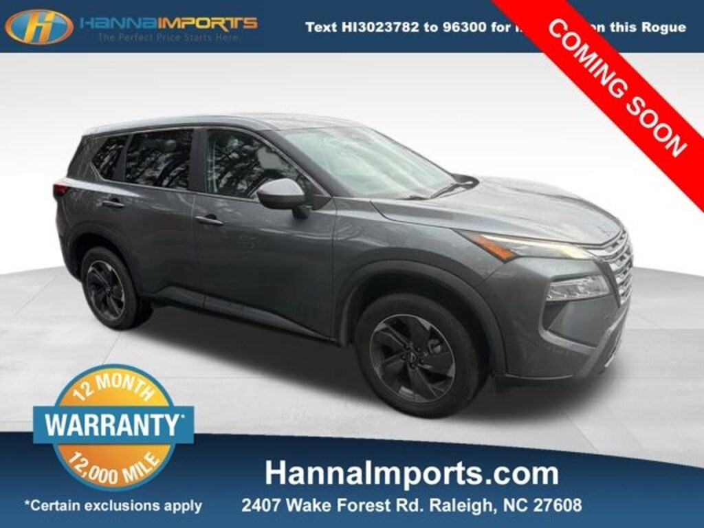 Why shop with Hanna Imports? We specialize in hand-selecting top-quality used cars, trucks, and SUVs for drivers across Raleigh, Durham, Cary, Chapel Hill, and the greater Triangle area of North Carolina. Our massive selection of 1,000+ vehicles on our Raleigh lot is carefully curated to include the most sought-after models, all priced below market value. We believe in transparency and efficiencyâ"our vehicles are aggressively priced from the start, which means no haggling, no hassle, and no wasted time. The price you see is our absolute best price. Whether you're coming from Wake Forest, Apex, Garner, or anywhere in central NC, weâre committed to making your car-buying experience smooth, affordable, and enjoyable. Come see why Hanna Imports is one of the most trusted used car dealerships in North Carolina! Used Nissan Rogue in Raleigh. Used Nissan Rogue in North Carolina, Rogue SV, Power Liftgate, Rear Parking Sensors, Remote keyless entry, 4-Wheel Disc Brakes, 5.676 Axle Ratio, 6 Speakers, ABS brakes, Air Conditioning, Alloy wheels, AM/FM radio: SiriusXM, Auto High-beam Headlights, Automatic temperature control, Brake assist, Bumpers: body-color, Cloth Seat Trim w/Patterned Inserts, Delay-off headlights, Driver door bin, Driver vanity mirror, Dual front impact airbags, Dual front side impact airbags, Electronic Stability Control, Emergency communication system: NissanConnect Services, Four wheel independent suspension, Front anti-roll bar, Front Bucket Seats, Front Center Armrest, Front dual zone A/C, Front reading lights, Fully automatic headlights, Heated door mirrors, Illuminated entry, Knee airbag, Low tire pressure warning, NissanConnect featuring Apple CarPlay and Android Auto, Occupant sensing airbag, Outside temperature display, Overhead airbag, Overhead console, Panic alarm, Passenger door bin, Passenger vanity mirror, Power door mirrors, Power driver seat, Power steering, Power windows, Radio data system, Radio: AM/FM NissanConnect, Rear anti-roll bar, Rear seat center armrest, Rear side impact airbag, Rear window defroster, Rear window wiper, Speed control, Speed-Sensitive Wipers, Split folding rear seat, Spoiler, Steering wheel mounted audio controls, Tachometer, Telescoping steering wheel, Tilt steering wheel, Traction control, Trip computer, Variably intermittent wipers, and Wheels: 18" Dark Painted Machine Finished Alloy.