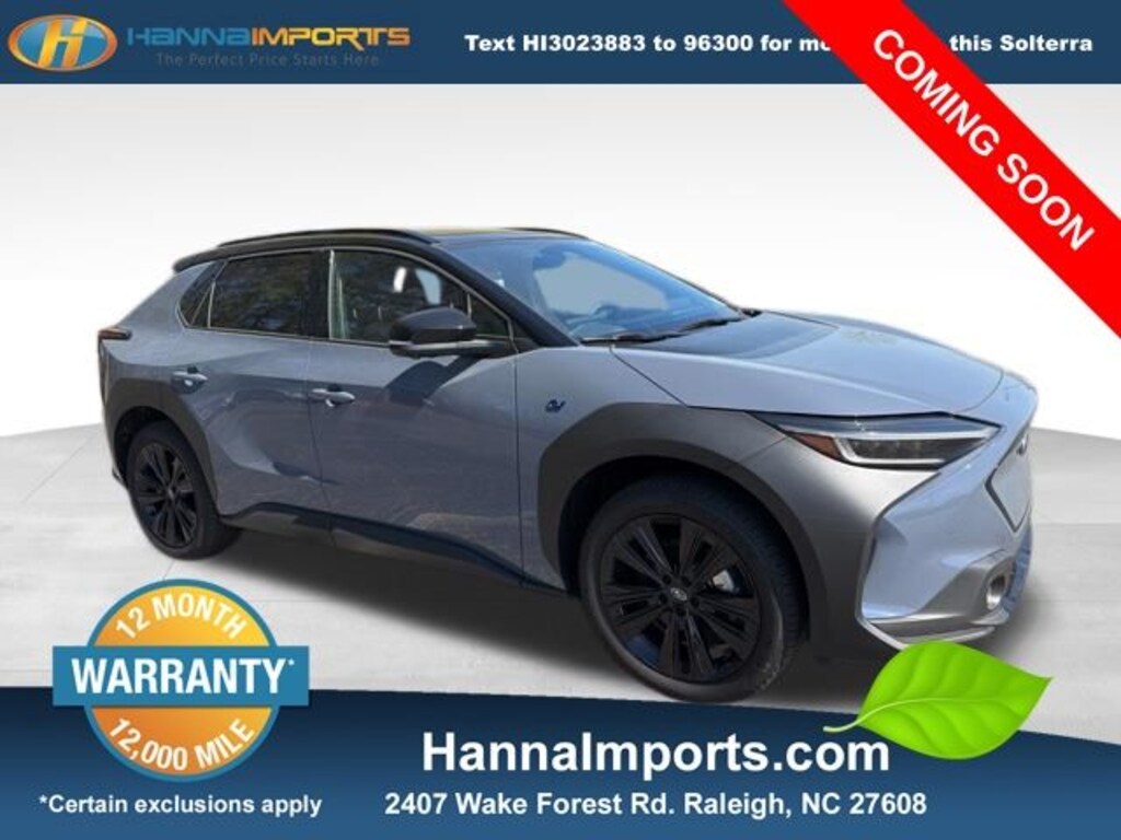 Why shop with Hanna Imports? We specialize in hand-selecting top-quality used cars, trucks, and SUVs for drivers across Raleigh, Durham, Cary, Chapel Hill, and the greater Triangle area of North Carolina. Our massive selection of 1,000+ vehicles on our Raleigh lot is carefully curated to include the most sought-after models, all priced below market value. We believe in transparency and efficiencyâ"our vehicles are aggressively priced from the start, which means no haggling, no hassle, and no wasted time. The price you see is our absolute best price. Whether you're coming from Wake Forest, Apex, Garner, or anywhere in central NC, weâre committed to making your car-buying experience smooth, affordable, and enjoyable. Come see why Hanna Imports is one of the most trusted used car dealerships in North Carolina! Used Subaru Solterra in Raleigh. Used Subaru Solterra in North Carolina, Solterra Touring, AWD, Exterior Parking Camera Rear, Heated & Ventilated Front Bucket Seats, Heated rear seats, Navigation system: Cloud Navigation System (Subscription required), Power Liftgate, Remote keyless entry, 11 Speakers, 4-Wheel Disc Brakes, ABS brakes, Air Conditioning, All-Weather Floor Liners, Alloy wheels, AM/FM radio: SiriusXM, Apple CarPlay & Android Auto, Auto High-beam Headlights, Auto-dimming Rear-View mirror, Automatic temperature control, Brake assist, Bumpers: body-color, Driver door bin, Driver vanity mirror, Dual front impact airbags, Dual front side impact airbags, Electronic Stability Control, Emergency communication system: Subaru Solterra Connect - Safety Connect (1 year trial included), Four wheel independent suspension, Front anti-roll bar, Front Bucket Seats, Front Center Armrest, Front dual zone A/C, Front fog lights, Front reading lights, Fully automatic headlights, Garage door transmitter: HomeLink, harman/kardon® Speakers, Heated door mirrors, Heated front seats, Heated steering wheel, Illuminated entry, Knee airbag, Leather steering wheel, Low tire pressure warning, Memory seat, Occupant sensing airbag, Outside temperature display, Overhead airbag, Overhead console, Panic alarm, Passenger door bin, Passenger vanity mirror, Power door mirrors, Power driver seat, Power passenger seat, Power steering, Power windows, Radio data system, Radio: Subaru 12.3" Multimedia System, Rain sensing wipers, Rear anti-roll bar, Rear reading lights, Rear seat center armrest, Rear window defroster, Security system, Speed control, Speed-sensing steering, Split folding rear seat, Spoiler, StarTex Upholstery, Steering wheel mounted audio controls, Telescoping steering wheel, Tilt steering wheel, Traction control, Trip computer, Turn signal indicator mirrors, Variably intermittent wipers, Ventilated front seats, and Wheels: 20" x 7.5" J Aluminum-Alloy Black Finish.