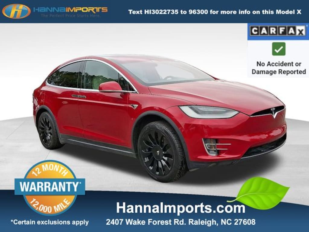 Why shop with Hanna Imports? We specialize in hand-selecting top-quality used cars, trucks, and SUVs for drivers across Raleigh, Durham, Cary, Chapel Hill, and the greater Triangle area of North Carolina. Our massive selection of 1,000+ vehicles on our Raleigh lot is carefully curated to include the most sought-after models, all priced below market value. We believe in transparency and efficiencyâ"our vehicles are aggressively priced from the start, which means no haggling, no hassle, and no wasted time. The price you see is our absolute best price. Whether you're coming from Wake Forest, Apex, Garner, or anywhere in central NC, weâre committed to making your car-buying experience smooth, affordable, and enjoyable. Come see why Hanna Imports is one of the most trusted used car dealerships in North Carolina! Used Tesla Model X in Raleigh. Used Tesla Model X in North Carolina, Model X Long Range, AWD, 7 Seat Interior, Adaptive suspension, Exterior Parking Camera Rear, Navigation System, Power Liftgate, Remote keyless entry, 17 Speakers, 4-Wheel Disc Brakes, 9.73 Axle Ratio, ABS brakes, Air Conditioning, Alloy wheels, Auto High-beam Headlights, Auto tilt-away steering wheel, Auto-dimming door mirrors, Auto-dimming Rear-View mirror, Auto-leveling suspension, Automatic temperature control, Brake assist, Bumpers: body-color, Compass, Delay-off headlights, Door auto-latch, Driver door bin, Driver vanity mirror, Dual front impact airbags, Dual front side impact airbags, Electronic Stability Control, Four wheel independent suspension, Front anti-roll bar, Front Bucket Seats, Front Center Armrest, Front dual zone A/C, Front fog lights, Front reading lights, Fully automatic headlights, Garage door transmitter: Homelink, Genuine wood console insert, Genuine wood dashboard insert, Genuine wood door panel insert, Head restraints memory, Heated door mirrors, Heated front seats, Heated rear seats, Heated steering wheel, Illuminated entry, Knee airbag, Leather steering wheel, Low tire pressure warning, Memory seat, Occupant sensing airbag, Outside temperature display, Overhead airbag, Passenger door bin, Passenger vanity mirror, Power adjustable front head restraints, Power door mirrors, Power driver seat, Power passenger seat, Power steering, Power windows, Premium Audio System, Premium Seat Trim, Radio data system, Rain sensing wipers, Rear anti-roll bar, Rear reading lights, Rear side impact airbag, Rear window defroster, Security system, Speed control, Speed-sensing steering, Speed-Sensitive Wipers, Split folding rear seat, Spoiler, Steering wheel memory, Steering wheel mounted A/C controls, Steering wheel mounted audio controls, Telescoping steering wheel, Tilt steering wheel, Traction control, Trip computer, Variably intermittent wipers, and Wheels: 20" x 9.0J Front & 20" x 9.5J Rear Silver.