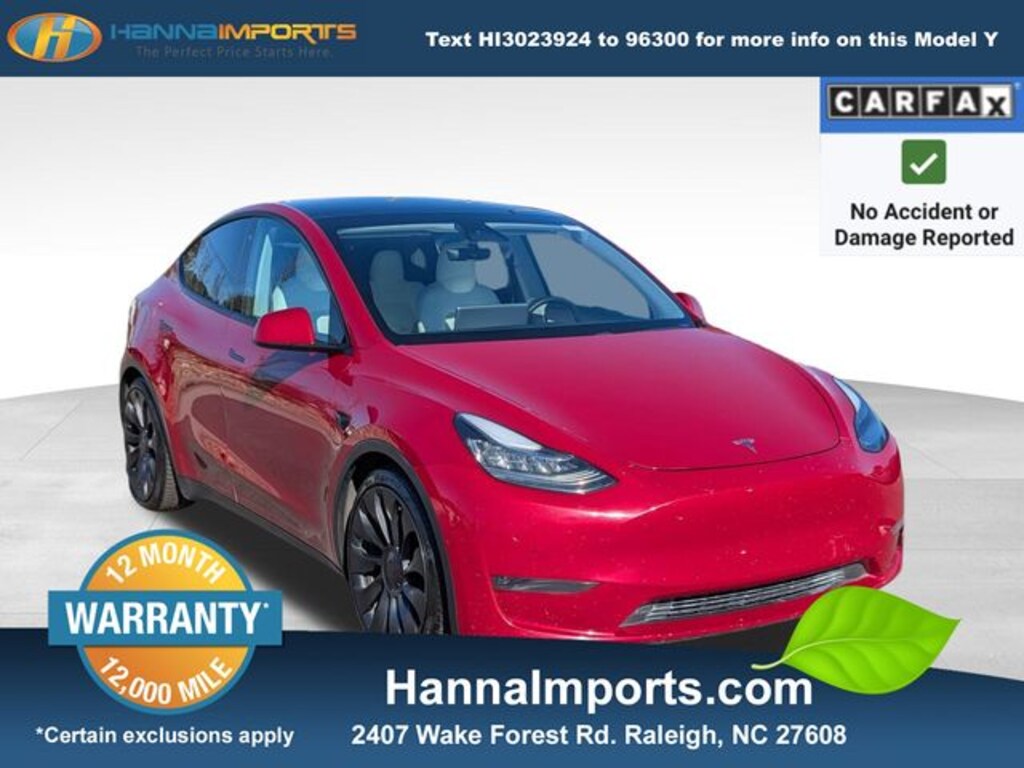 Why shop with Hanna Imports? We specialize in hand-selecting top-quality used cars, trucks, and SUVs for drivers across Raleigh, Durham, Cary, Chapel Hill, and the greater Triangle area of North Carolina. Our massive selection of 1,000+ vehicles on our Raleigh lot is carefully curated to include the most sought-after models, all priced below market value. We believe in transparency and efficiencyâ"our vehicles are aggressively priced from the start, which means no haggling, no hassle, and no wasted time. The price you see is our absolute best price. Whether you're coming from Wake Forest, Apex, Garner, or anywhere in central NC, weâre committed to making your car-buying experience smooth, affordable, and enjoyable. Come see why Hanna Imports is one of the most trusted used car dealerships in North Carolina! Used Tesla Model Y in Raleigh. Used Tesla Model Y in North Carolina, Model Y Performance, AWD, Exterior Parking Camera Rear, Navigation System, Power Liftgate, Remote keyless entry, 15 Speakers, 4-Wheel Disc Brakes, 5 Seat Interior, 9.0 Axle Ratio, ABS brakes, Air Conditioning, Alloy wheels, Auto High-beam Headlights, Auto tilt-away steering wheel, Auto-dimming door mirrors, Auto-dimming Rear-View mirror, Automatic temperature control, Brake assist, Bumpers: body-color, Compass, Delay-off headlights, Driver door bin, Driver vanity mirror, Dual front impact airbags, Dual front side impact airbags, Electronic Stability Control, Four wheel independent suspension, Front anti-roll bar, Front Bucket Seats, Front Center Armrest, Front dual zone A/C, Front fog lights, Front reading lights, Fully automatic headlights, Genuine wood dashboard insert, Heated door mirrors, Heated front seats, Heated rear seats, Illuminated entry, Knee airbag, Low tire pressure warning, Memory seat, Occupant sensing airbag, Outside temperature display, Overhead airbag, Passenger door bin, Passenger vanity mirror, Power door mirrors, Power driver seat, Power passenger seat, Power steering, Power windows, Premium Audio System, Premium Seat Trim, Radio data system, Rain sensing wipers, Rear reading lights, Rear seat center armrest, Rear window defroster, Security system, Speed control, Speed-sensing steering, Split folding rear seat, Spoiler, Steering wheel memory, Steering wheel mounted A/C controls, Steering wheel mounted audio controls, Telescoping steering wheel, Tilt steering wheel, Traction control, Trip computer, Variably intermittent wipers, and Wheels: 21" x 9.5" Fr & 21" x 10.5" Rr Uberturbine.