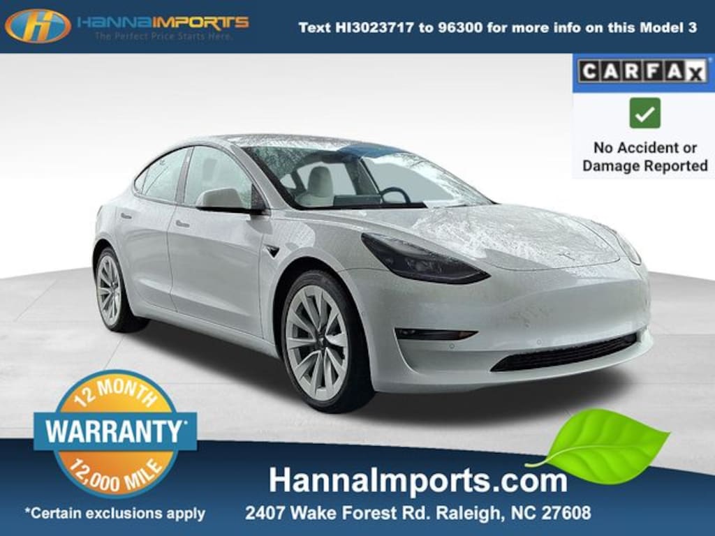 Why shop with Hanna Imports? We specialize in hand-selecting top-quality used cars, trucks, and SUVs for drivers across Raleigh, Durham, Cary, Chapel Hill, and the greater Triangle area of North Carolina. Our massive selection of 1,000+ vehicles on our Raleigh lot is carefully curated to include the most sought-after models, all priced below market value. We believe in transparency and efficiencyâ"our vehicles are aggressively priced from the start, which means no haggling, no hassle, and no wasted time. The price you see is our absolute best price. Whether you're coming from Wake Forest, Apex, Garner, or anywhere in central NC, weâre committed to making your car-buying experience smooth, affordable, and enjoyable. Come see why Hanna Imports is one of the most trusted used car dealerships in North Carolina! Used Tesla Model 3 in Raleigh. Used Tesla Model 3 in North Carolina, Model 3 Long Range, AWD, Exterior Parking Camera Rear, Lane Departure Warning System, Navigation System, 14 Speakers, 4-Wheel Disc Brakes, ABS brakes, Air Conditioning, Alloy wheels, Audio memory, Auto High-beam Headlights, Auto-dimming door mirrors, Auto-dimming Rear-View mirror, Automatic temperature control, Brake assist, Bumpers: body-color, Compass, Delay-off headlights, Driver door bin, Driver vanity mirror, Dual front impact airbags, Dual front side impact airbags, Electronic Stability Control, Four wheel independent suspension, Front anti-roll bar, Front Bucket Seats, Front Center Armrest, Front dual zone A/C, Front fog lights, Front reading lights, Fully automatic headlights, Genuine wood dashboard insert, Heated door mirrors, Heated front seats, Heated rear seats, Heated steering wheel, HVAC memory, Illuminated entry, Knee airbag, Low tire pressure warning, Memory seat, Occupant sensing airbag, Outside temperature display, Overhead airbag, Passenger door bin, Passenger vanity mirror, Power door mirrors, Power driver seat, Power passenger seat, Power steering, Power windows, Premium Audio System, Premium Heated Front Bucket Seats, Premium Seat Trim, Radio data system, Rain sensing wipers, Rear reading lights, Rear seat center armrest, Rear window defroster, Security system, Speed control, Speed-sensing steering, Split folding rear seat, Steering wheel memory, Steering wheel mounted A/C controls, Steering wheel mounted audio controls, Telescoping steering wheel, Tilt steering wheel, Traction control, Trip computer, Variably intermittent wipers, and Wheels: 18" x 8.5" Aero.