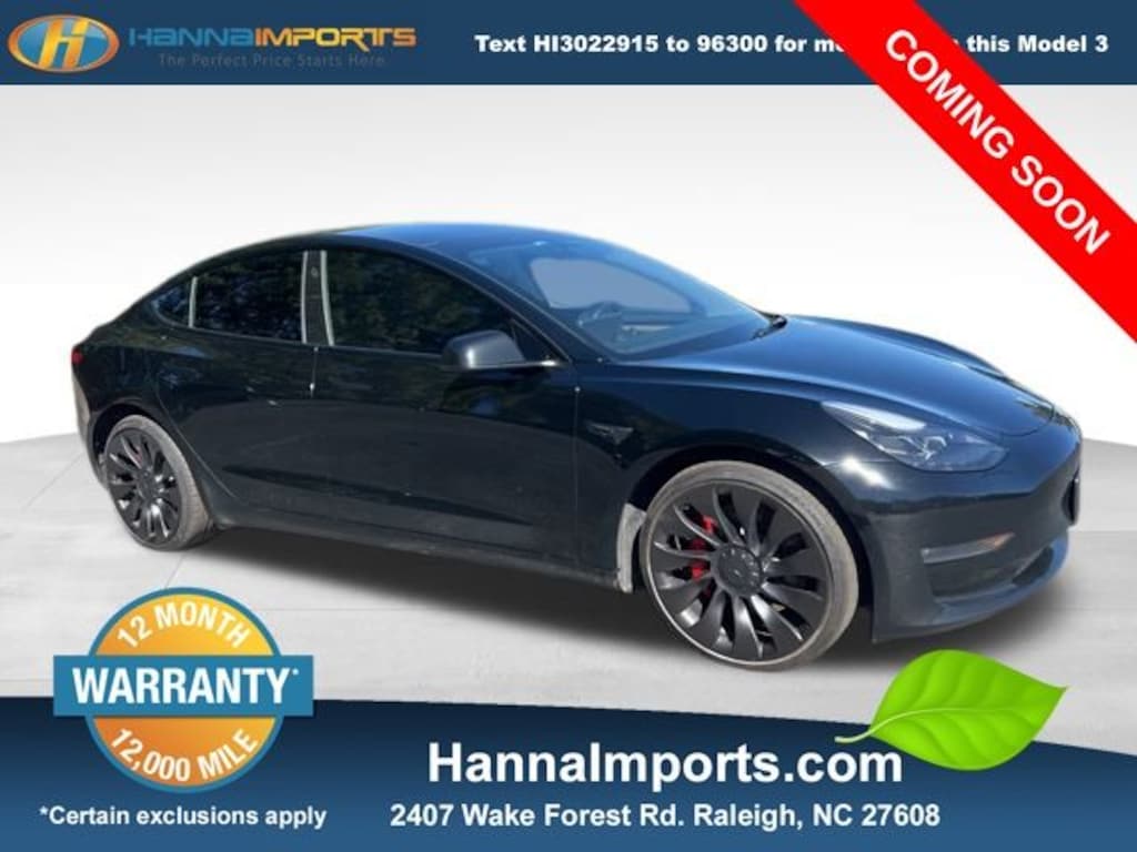 Why shop with Hanna Imports? We specialize in hand-selecting top-quality used cars, trucks, and SUVs for drivers across Raleigh, Durham, Cary, Chapel Hill, and the greater Triangle area of North Carolina. Our massive selection of 1,000+ vehicles on our Raleigh lot is carefully curated to include the most sought-after models, all priced below market value. We believe in transparency and efficiencyâ"our vehicles are aggressively priced from the start, which means no haggling, no hassle, and no wasted time. The price you see is our absolute best price. Whether you're coming from Wake Forest, Apex, Garner, or anywhere in central NC, weâre committed to making your car-buying experience smooth, affordable, and enjoyable. Come see why Hanna Imports is one of the most trusted used car dealerships in North Carolina! Used Tesla Model 3 in Raleigh. Used Tesla Model 3 in North Carolina, Model 3 Performance, AWD, Exterior Parking Camera Rear, Heated steering wheel, Lane Departure Warning System, Navigation System, 14 Speakers, 4-Wheel Disc Brakes, ABS brakes, Air Conditioning, Alloy wheels, Audio memory, Auto High-beam Headlights, Auto-dimming door mirrors, Auto-dimming Rear-View mirror, Automatic temperature control, Brake assist, Bumpers: body-color, Compass, Delay-off headlights, Driver door bin, Driver vanity mirror, Dual front impact airbags, Dual front side impact airbags, Electronic Stability Control, Emergency communication system, Four wheel independent suspension, Front anti-roll bar, Front Bucket Seats, Front Center Armrest, Front dual zone A/C, Front fog lights, Front reading lights, Fully automatic headlights, Genuine wood dashboard insert, Heated door mirrors, Heated Front Bucket Seats, Heated front seats, Heated rear seats, HVAC memory, Illuminated entry, Knee airbag, Low tire pressure warning, Memory seat, Occupant sensing airbag, Outside temperature display, Overhead airbag, Passenger door bin, Passenger vanity mirror, Power door mirrors, Power driver seat, Power passenger seat, Power steering, Power windows, Premium Audio System, Premium Seat Trim, Radio data system, Rain sensing wipers, Rear reading lights, Rear seat center armrest, Rear window defroster, Security system, Speed control, Speed-sensing steering, Split folding rear seat, Spoiler, Steering wheel memory, Steering wheel mounted A/C controls, Steering wheel mounted audio controls, Telescoping steering wheel, Tilt steering wheel, Traction control, Trip computer, Variably intermittent wipers, and Wheels: 20" x 9.0" Uberturbine.
