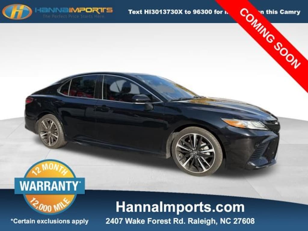 Why shop with Hanna Imports? We specialize in hand-selecting top-quality used cars, trucks, and SUVs for drivers across Raleigh, Durham, Cary, Chapel Hill, and the greater Triangle area of North Carolina. Our massive selection of 1,000+ vehicles on our Raleigh lot is carefully curated to include the most sought-after models, all priced below market value. We believe in transparency and efficiencyâ"our vehicles are aggressively priced from the start, which means no haggling, no hassle, and no wasted time. The price you see is our absolute best price. Whether you're coming from Wake Forest, Apex, Garner, or anywhere in central NC, weâre committed to making your car-buying experience smooth, affordable, and enjoyable. Come see why Hanna Imports is one of the most trusted used car dealerships in North Carolina! Used Toyota Camry in Raleigh. Used Toyota Camry in North Carolina, Camry XSE, Cockpit Red w/Perforated Leather Seat Trim, Apple CarPlay, Exterior Parking Camera Rear, Heated front seats, Panoramic Roof, Remote keyless entry, 4-Wheel Disc Brakes, 6 Speakers, ABS brakes, Air Conditioning, Alloy wheels, AM/FM radio: SiriusXM, Auto High-beam Headlights, Auto-dimming Rear-View mirror, Automatic temperature control, Brake assist, Bumpers: body-color, CD player, Compass, Delay-off headlights, Driver door bin, Driver vanity mirror, Dual front impact airbags, Dual front side impact airbags, Electronic Stability Control, Emergency communication system: Safety Connect, Four wheel independent suspension, Front anti-roll bar, Front Bucket Seats, Front Center Armrest, Front dual zone A/C, Front reading lights, Fully automatic headlights, Garage door transmitter: HomeLink, Heated door mirrors, Illuminated entry, Knee airbag, Leather Shift Knob, Low tire pressure warning, Multi-Stage Heated Front Bucket Seats, Occupant sensing airbag, Outside temperature display, Overhead airbag, Overhead console, Panic alarm, Passenger door bin, Passenger vanity mirror, Perforated Leather Seat Trim, Power door mirrors, Power driver seat, Power passenger seat, Power steering, Power windows, Radio data system, Radio: Entune 3.0 Audio Plus w/App Suite, Rear anti-roll bar, Rear reading lights, Rear seat center armrest, Rear side impact airbag, Rear window defroster, Security system, Speed control, Speed-sensing steering, Split folding rear seat, Spoiler, Sport steering wheel, Steering wheel mounted audio controls, Tachometer, Telescoping steering wheel, Tilt steering wheel, Traction control, Trip computer, Turn signal indicator mirrors, Variably intermittent wipers, and Wheels: 8.0J x 19" Black Machined-Finish Alloy.