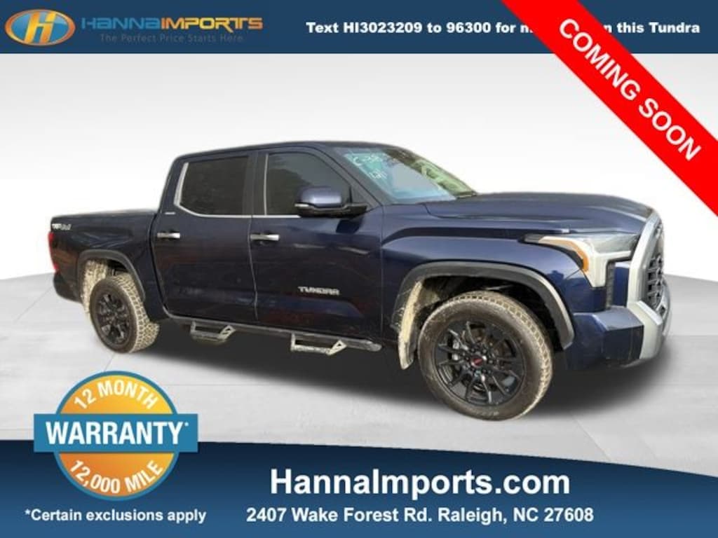 Why shop with Hanna Imports? We specialize in hand-selecting top-quality used cars, trucks, and SUVs for drivers across Raleigh, Durham, Cary, Chapel Hill, and the greater Triangle area of North Carolina. Our massive selection of 1,000+ vehicles on our Raleigh lot is carefully curated to include the most sought-after models, all priced below market value. We believe in transparency and efficiencyâ"our vehicles are aggressively priced from the start, which means no haggling, no hassle, and no wasted time. The price you see is our absolute best price. Whether you're coming from Wake Forest, Apex, Garner, or anywhere in central NC, weâre committed to making your car-buying experience smooth, affordable, and enjoyable. Come see why Hanna Imports is one of the most trusted used car dealerships in North Carolina! Used Toyota Tundra in Raleigh. Used Toyota Tundra in North Carolina, Tundra Limited, 4WD, Black w/Leather Seat Trim, 20" Alloy Wheels, 3.31 Axle Ratio, 4-Wheel Disc Brakes, 8-Way Pwr Adjustable Heated/Ventilated Front Seats, 9 Speakers, ABS brakes, Air Conditioning, Alloy wheels, AM/FM radio: SiriusXM, Apple CarPlay/Android Auto, Auto High-beam Headlights, Auto-dimming door mirrors, Auto-dimming Rear-View mirror, Automatic temperature control, Brake assist, Bumpers: body-color, Delay-off headlights, Driver door bin, Driver vanity mirror, Dual front impact airbags, Dual front side impact airbags, Electronic Stability Control, Emergency communication system: Safety Connect with 1-year trial, Exterior Parking Camera Rear, Front anti-roll bar, Front Bucket Seats, Front Center Armrest, Front dual zone A/C, Front fog lights, Front reading lights, Front wheel independent suspension, Fully automatic headlights, Garage door transmitter: HomeLink, Heated door mirrors, Heated front seats, Illuminated entry, Knee airbag, Leather Shift Knob, Low tire pressure warning, Memory seat, Navigation System, Occupant sensing airbag, Outside temperature display, Overhead airbag, Overhead console, Panic alarm, Passenger door bin, Passenger vanity mirror, Power door mirrors, Power driver seat, Power passenger seat, Power steering, Power windows, Radio data system, Radio: Audio Multimedia System, Rear reading lights, Rear seat center armrest, Rear step bumper, Rear window defroster, Remote keyless entry, Safety Connect, Security system, SofTex Seat Trim, Speed control, Speed-sensing steering, Split folding rear seat, Steering wheel mounted audio controls, Tachometer, Telescoping steering wheel, Tilt steering wheel, Traction control, Trip computer, Turn signal indicator mirrors, Variably intermittent wipers, Ventilated front seats, and Voltmeter.