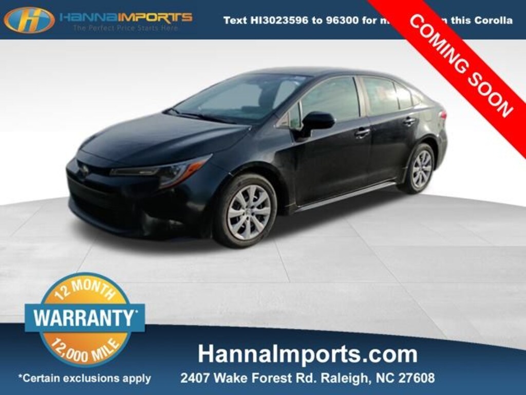 Why shop with Hanna Imports? We specialize in hand-selecting top-quality used cars, trucks, and SUVs for drivers across Raleigh, Durham, Cary, Chapel Hill, and the greater Triangle area of North Carolina. Our massive selection of 1,000+ vehicles on our Raleigh lot is carefully curated to include the most sought-after models, all priced below market value. We believe in transparency and efficiencyâ"our vehicles are aggressively priced from the start, which means no haggling, no hassle, and no wasted time. The price you see is our absolute best price. Whether you're coming from Wake Forest, Apex, Garner, or anywhere in central NC, weâre committed to making your car-buying experience smooth, affordable, and enjoyable. Come see why Hanna Imports is one of the most trusted used car dealerships in North Carolina! Used Toyota Corolla in Raleigh. Used Toyota Corolla in North Carolina, Corolla LE, Remote keyless entry, 16" Steel Wheels w/Covers, 4-Wheel Disc Brakes, 6 Speakers, ABS brakes, Air Conditioning, AM/FM radio: SiriusXM, Auto High-beam Headlights, Automatic temperature control, Brake assist, Bumpers: body-color, Delay-off headlights, Driver door bin, Driver vanity mirror, Dual front impact airbags, Dual front side impact airbags, Electronic Stability Control, Emergency communication system: Safety Connect (up to 10-year trial subscription), Exterior Parking Camera Rear, Fabric Seat Trim, Front anti-roll bar, Front Bucket Seats, Front Center Armrest, Front reading lights, Front wheel independent suspension, Fully automatic headlights, Illuminated entry, Knee airbag, Low tire pressure warning, Occupant sensing airbag, Outside temperature display, Overhead airbag, Panic alarm, Passenger door bin, Passenger vanity mirror, Power door mirrors, Power steering, Power windows, Radio data system, Radio: 8" Toyota Audio Multimedia, Rear anti-roll bar, Rear seat center armrest, Rear side impact airbag, Rear window defroster, Speed control, Split folding rear seat, Steering wheel mounted audio controls, Tachometer, Telescoping steering wheel, Tilt steering wheel, Traction control, and Trip computer.