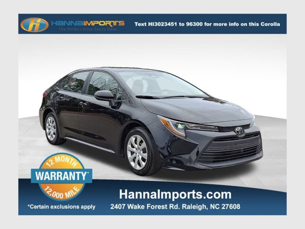 Why shop with Hanna Imports? We specialize in hand-selecting top-quality used cars, trucks, and SUVs for drivers across Raleigh, Durham, Cary, Chapel Hill, and the greater Triangle area of North Carolina. Our massive selection of 1,000+ vehicles on our Raleigh lot is carefully curated to include the most sought-after models, all priced below market value. We believe in transparency and efficiencyâ"our vehicles are aggressively priced from the start, which means no haggling, no hassle, and no wasted time. The price you see is our absolute best price. Whether you're coming from Wake Forest, Apex, Garner, or anywhere in central NC, weâre committed to making your car-buying experience smooth, affordable, and enjoyable. Come see why Hanna Imports is one of the most trusted used car dealerships in North Carolina! Used Toyota Corolla in Raleigh. Used Toyota Corolla in North Carolina, Corolla LE, Exterior Parking Camera Rear, 16" Steel Wheels w/Covers, 4-Wheel Disc Brakes, 6 Speakers, ABS brakes, Air Conditioning, AM/FM radio: SiriusXM, Auto High-beam Headlights, Automatic temperature control, Brake assist, Bumpers: body-color, Delay-off headlights, Driver door bin, Driver vanity mirror, Dual front impact airbags, Dual front side impact airbags, Electronic Stability Control, Emergency communication system: Safety Connect (up to 10-year trial subscription), Fabric Seat Trim, Front anti-roll bar, Front Bucket Seats, Front Center Armrest, Front reading lights, Front wheel independent suspension, Fully automatic headlights, Illuminated entry, Knee airbag, Low tire pressure warning, Occupant sensing airbag, Outside temperature display, Overhead airbag, Panic alarm, Passenger door bin, Passenger vanity mirror, Power door mirrors, Power steering, Power windows, Radio data system, Radio: 8" Toyota Audio Multimedia, Rear anti-roll bar, Rear seat center armrest, Rear side impact airbag, Rear window defroster, Remote keyless entry, Speed control, Split folding rear seat, Steering wheel mounted audio controls, Tachometer, Telescoping steering wheel, Tilt steering wheel, Traction control, and Trip computer.