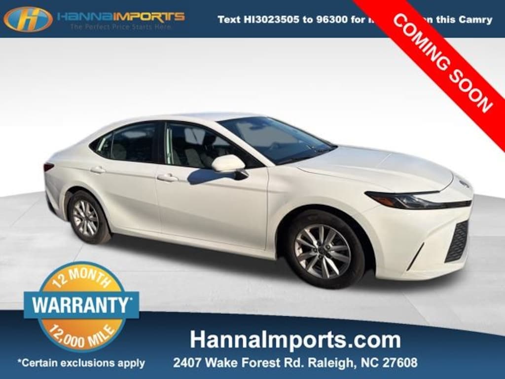 Why shop with Hanna Imports? We specialize in hand-selecting top-quality used cars, trucks, and SUVs for drivers across Raleigh, Durham, Cary, Chapel Hill, and the greater Triangle area of North Carolina. Our massive selection of 1,000+ vehicles on our Raleigh lot is carefully curated to include the most sought-after models, all priced below market value. We believe in transparency and efficiencyâ"our vehicles are aggressively priced from the start, which means no haggling, no hassle, and no wasted time. The price you see is our absolute best price. Whether you're coming from Wake Forest, Apex, Garner, or anywhere in central NC, weâre committed to making your car-buying experience smooth, affordable, and enjoyable. Come see why Hanna Imports is one of the most trusted used car dealerships in North Carolina! Used Toyota Camry in Raleigh. Used Toyota Camry in North Carolina, Camry LE, 2.5L 4-Cylinder 16V DOHC, Black w/Fabric Seat Trim, Apple CarPlay/Android Auto, Exterior Parking Camera Rear, Remote keyless entry, 4-Wheel Disc Brakes, 6 Speakers, ABS brakes, Air Conditioning, Alloy wheels, AM/FM radio: SiriusXM, Auto High-beam Headlights, Automatic temperature control, Brake assist, Bumpers: body-color, Delay-off headlights, Driver door bin, Driver vanity mirror, Dual front impact airbags, Dual front side impact airbags, Electronic Stability Control, Emergency communication system: Safety Connect (up to 10-year trial subscription), Fabric Seat Trim, Four wheel independent suspension, Front anti-roll bar, Front Bucket Seats, Front Center Armrest, Front dual zone A/C, Front reading lights, Fully automatic headlights, Heated door mirrors, Illuminated entry, Knee airbag, Low tire pressure warning, Occupant sensing airbag, Outside temperature display, Overhead airbag, Overhead console, Panic alarm, Passenger door bin, Passenger vanity mirror, Power door mirrors, Power steering, Power windows, Radio data system, Radio: Toyota Audio Multimedia w/8" Touchscreen, Rear anti-roll bar, Rear seat center armrest, Rear side impact airbag, Rear window defroster, Security system, Speed control, Speed-sensing steering, Split folding rear seat, Steering wheel mounted audio controls, Telescoping steering wheel, Tilt steering wheel, Traction control, Trip computer, Turn signal indicator mirrors, Variably intermittent wipers, and Wheels: 16" Silver-Finished Alloy.