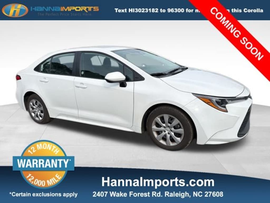 Why shop with Hanna Imports? We specialize in hand-selecting top-quality used cars, trucks, and SUVs for drivers across Raleigh, Durham, Cary, Chapel Hill, and the greater Triangle area of North Carolina. Our massive selection of 1,000+ vehicles on our Raleigh lot is carefully curated to include the most sought-after models, all priced below market value. We believe in transparency and efficiencyâ"our vehicles are aggressively priced from the start, which means no haggling, no hassle, and no wasted time. The price you see is our absolute best price. Whether you're coming from Wake Forest, Apex, Garner, or anywhere in central NC, weâre committed to making your car-buying experience smooth, affordable, and enjoyable. Come see why Hanna Imports is one of the most trusted used car dealerships in North Carolina! Used Toyota Corolla in Raleigh. Used Toyota Corolla in North Carolina, Corolla LE, Apple CarPlay/Android Auto, Exterior Parking Camera Rear, 16" Steel Wheels w/Covers, 4-Wheel Disc Brakes, 6 Speakers, ABS brakes, Air Conditioning, AM/FM radio: SiriusXM, Auto High-beam Headlights, Automatic temperature control, Brake assist, Bumpers: body-color, Delay-off headlights, Driver door bin, Driver vanity mirror, Dual front impact airbags, Dual front side impact airbags, Electronic Stability Control, Emergency communication system: Safety Connect (up to 10-year trial subscription), Fabric Seat Trim, Front anti-roll bar, Front Bucket Seats, Front Center Armrest, Front reading lights, Front wheel independent suspension, Fully automatic headlights, Illuminated entry, Knee airbag, Low tire pressure warning, Occupant sensing airbag, Outside temperature display, Overhead airbag, Panic alarm, Passenger door bin, Passenger vanity mirror, Power door mirrors, Power steering, Power windows, Radio data system, Radio: 8" Toyota Audio Multimedia, Rear anti-roll bar, Rear seat center armrest, Rear side impact airbag, Rear window defroster, Remote keyless entry, Speed control, Split folding rear seat, Steering wheel mounted audio controls, Tachometer, Telescoping steering wheel, Tilt steering wheel, Traction control, and Trip computer.