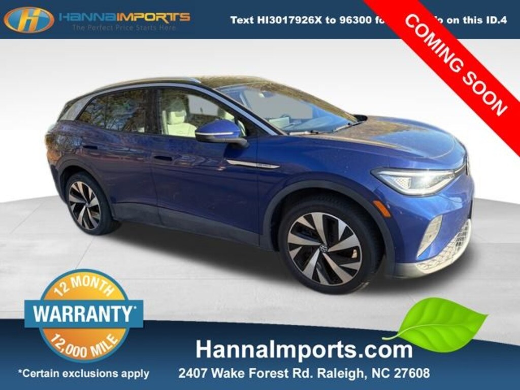 Why shop with Hanna Imports? We specialize in hand-selecting top-quality used cars, trucks, and SUVs for drivers across Raleigh, Durham, Cary, Chapel Hill, and the greater Triangle area of North Carolina. Our massive selection of 1,000+ vehicles on our Raleigh lot is carefully curated to include the most sought-after models, all priced below market value. We believe in transparency and efficiencyâ"our vehicles are aggressively priced from the start, which means no haggling, no hassle, and no wasted time. The price you see is our absolute best price. Whether you're coming from Wake Forest, Apex, Garner, or anywhere in central NC, weâre committed to making your car-buying experience smooth, affordable, and enjoyable. Come see why Hanna Imports is one of the most trusted used car dealerships in North Carolina! Used Volkswagen ID.4 in Raleigh. Used Volkswagen ID.4 in North Carolina, Gradient Package (Black Roof, Silver Accents on Front & Rear Bumpers, and Wheels: 20" Dynamic Design Machined Alloy), ID.4 Protection Package (IPT) (EV Roadside Assistance Kit, First Aid Kit, Rubber Mats Kit, and Heavy Duty Trunk Liner w/VW CarGo Blocks), ID.4 Pro S, AWD, Exterior Parking Camera Rear, Navigation System, Power Liftgate, Remote keyless entry, 3.90 Axle Ratio, 4 Wheel Independent Suspension, 7 Speakers, ABS brakes, Air Conditioning, Alloy wheels, Auto High-beam Headlights, Auto-dimming Rear-View mirror, Automatic temperature control, Brake assist, Bumpers: body-color, Delay-off headlights, Driver door bin, Driver vanity mirror, Driver's Seat Mounted Armrest, Dual front impact airbags, Dual front side impact airbags, Electronic Stability Control, Emergency communication system: VW Car-Net services (capabilities require enrollment or subscription), Four wheel independent suspension, Front anti-roll bar, Front Bucket Seats, Front dual zone A/C, Front fog lights, Front reading lights, Fully automatic headlights, Heated door mirrors, Heated Front Seats, Heated front seats, Heated steering wheel, Illuminated entry, Low tire pressure warning, Memory seat, Occupant sensing airbag, Outside temperature display, Overhead airbag, Overhead console, Panic alarm, Passenger door bin, Passenger seat mounted armrest, Passenger vanity mirror, Perforated V-Tex Leatherette Seating Surfaces, Power door mirrors, Power driver seat, Power passenger seat, Power steering, Power windows, Radio data system, Radio: Discover Pro Max w/12" Touchscreen Nav, Rain sensing wipers, Rear anti-roll bar, Rear reading lights, Rear seat center armrest, Rear window defroster, Rear window wiper, Roof rack: rails only, Speed control, Speed-sensing steering, Split folding rear seat, Spoiler, Steering wheel mounted audio controls, Telescoping steering wheel, Tilt steering wheel, Traction control, Trip computer, Turn signal indicator mirrors, Variably intermittent wipers, and Wheels: 19" 5-Spoke 2-Tone Machined Alloy.
