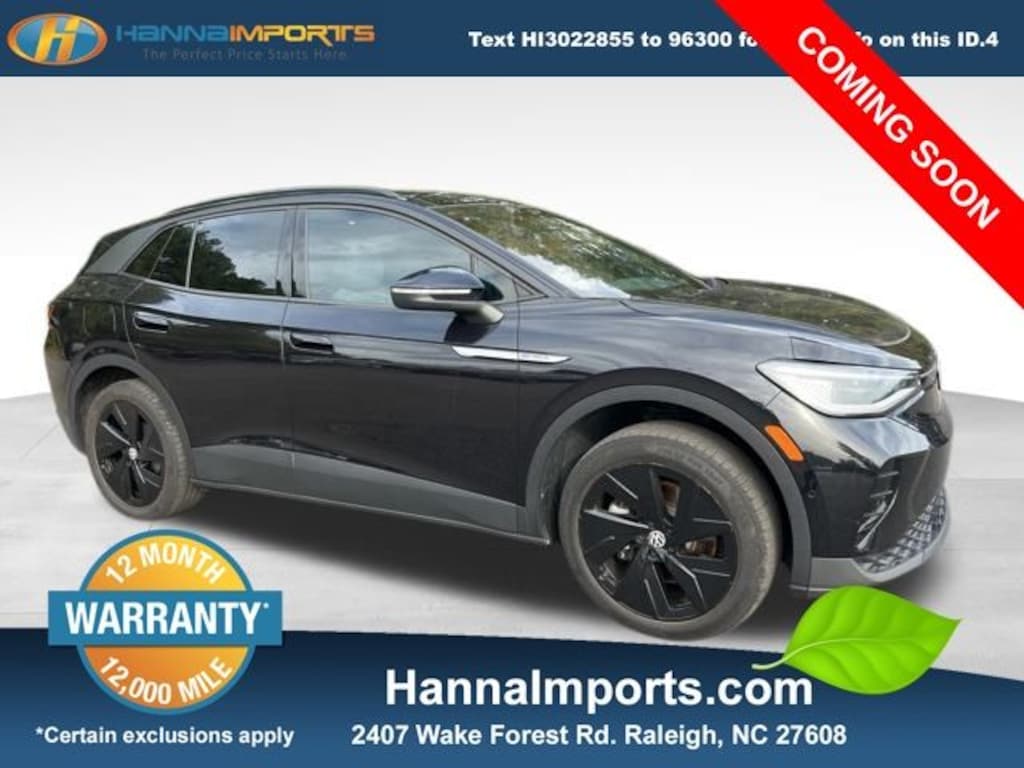 Why shop with Hanna Imports? We specialize in hand-selecting top-quality used cars, trucks, and SUVs for drivers across Raleigh, Durham, Cary, Chapel Hill, and the greater Triangle area of North Carolina. Our massive selection of 1,000+ vehicles on our Raleigh lot is carefully curated to include the most sought-after models, all priced below market value. We believe in transparency and efficiencyâ€"our vehicles are aggressively priced from the start, which means no haggling, no hassle, and no wasted time. The price you see is our absolute best price. Whether you're coming from Wake Forest, Apex, Garner, or anywhere in central NC, we’re committed to making your car-buying experience smooth, affordable, and enjoyable. Come see why Hanna Imports is one of the most trusted used car dealerships in North Carolina! Used Volkswagen ID.4 in Raleigh. Used Volkswagen ID.4 in North Carolina, ID.4 Pro S, AWD, Exterior Parking Camera Rear, Heated front seats, Heated steering wheel, Navigation System, Power Liftgate, Remote keyless entry, 3.90 Axle Ratio, 4 Wheel Independent Suspension, 7 Speakers, ABS brakes, Air Conditioning, Alloy wheels, Auto High-beam Headlights, Auto-dimming Rear-View mirror, Automatic temperature control, Brake assist, Bumpers: body-color, Delay-off headlights, Driver door bin, Driver vanity mirror, Driver's Seat Mounted Armrest, Dual front impact airbags, Dual front side impact airbags, Electronic Stability Control, Emergency communication system: VW Car-Net Safe & Secure 5-year, Four wheel independent suspension, Front anti-roll bar, Front Bucket Seats, Front dual zone A/C, Front fog lights, Front reading lights, Fully automatic headlights, Heated door mirrors, Heated Front Seats, Illuminated entry, Low tire pressure warning, Memory seat, Occupant sensing airbag, Outside temperature display, Overhead airbag, Overhead console, Panic alarm, Passenger door bin, Passenger seat mounted armrest, Passenger vanity mirror, Perforated V-Tex Leatherette Seating Surfaces, Power door mirrors, Power driver seat, Power passenger seat, Power steering, Power windows, Radio data system, Radio: Discover Pro Max w/12" Touchscreen Nav, Rain sensing wipers, Rear anti-roll bar, Rear reading lights, Rear seat center armrest, Rear window defroster, Rear window wiper, Speed control, Speed-sensing steering, Split folding rear seat, Spoiler, Steering wheel mounted audio controls, Telescoping steering wheel, Tilt steering wheel, Traction control, Trip computer, Turn signal indicator mirrors, Variably intermittent wipers, and Wheels: 20" 5-Spoke 2-Tone Machined Alloy.