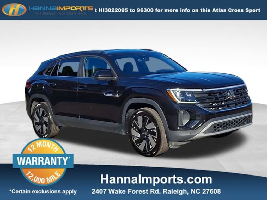 Why shop with Hanna Imports? We specialize in hand-selecting top-quality used cars, trucks, and SUVs for drivers across Raleigh, Durham, Cary, Chapel Hill, and the greater Triangle area of North Carolina. Our massive selection of 1,000+ vehicles on our Raleigh lot is carefully curated to include the most sought-after models, all priced below market value. We believe in transparency and efficiencyâ"our vehicles are aggressively priced from the start, which means no haggling, no hassle, and no wasted time. The price you see is our absolute best price. Whether you're coming from Wake Forest, Apex, Garner, or anywhere in central NC, weâre committed to making your car-buying experience smooth, affordable, and enjoyable. Come see why Hanna Imports is one of the most trusted used car dealerships in North Carolina! Used Volkswagen Atlas Cross Sport in Raleigh. Used Volkswagen Atlas Cross Sport in North Carolina, Atlas Cross Sport 2.0T SE w/Technology (A8), Exterior Parking Camera Rear, Heated front seats, Perforated V-Tex Leatherette Seating Surfaces, Power Liftgate, 3.60 Axle Ratio, 4-Wheel Disc Brakes, 4-Wheel Independent Suspension, 6 Speakers, ABS brakes, Air Conditioning, Alloy wheels, AM/FM radio: SiriusXM with 360L, Auto-dimming Rear-View mirror, Automatic temperature control, Brake assist, Bumpers: body-color, Compass, Delay-off headlights, Driver door bin, Driver vanity mirror, Dual front impact airbags, Dual front side impact airbags, Electronic Stability Control, Emergency communication system: VW Car-Net Safe & Secure 5-year, Four wheel independent suspension, Front anti-roll bar, Front Bucket Seats, Front Center Armrest, Front dual zone A/C, Front fog lights, Front reading lights, Fully automatic headlights, Heated & Actively Ventilated Front Seats, Heated door mirrors, Heated steering wheel, Illuminated entry, Low tire pressure warning, Occupant sensing airbag, Outside temperature display, Overhead airbag, Overhead console, Panic alarm, Passenger door bin, Passenger vanity mirror, Power door mirrors, Power driver seat, Power steering, Power windows, Radio data system, Radio: MIB3 Composition Media AM/FM/HD, Rain sensing wipers, Rear anti-roll bar, Rear reading lights, Rear seat center armrest, Rear window defroster, Rear window wiper, Remote keyless entry, Security system, Speed control, Speed-sensing steering, Split folding rear seat, Spoiler, Steering wheel mounted audio controls, Tachometer, Telescoping steering wheel, Tilt steering wheel, Traction control, Trip computer, Turn signal indicator mirrors, Variably intermittent wipers, Ventilated front seats, and Wheels: 20" 5-Spoke 2-Tone Machined Alloy.